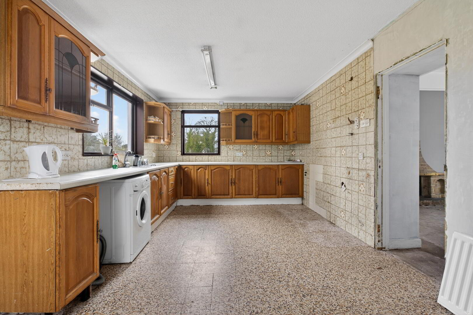 Fitted kitchen finished in oak with space for washing machine, 1 1/2 stainless steel sink unit and mixer tap, partly tiled surround, terrazzo tiled flooring extending through