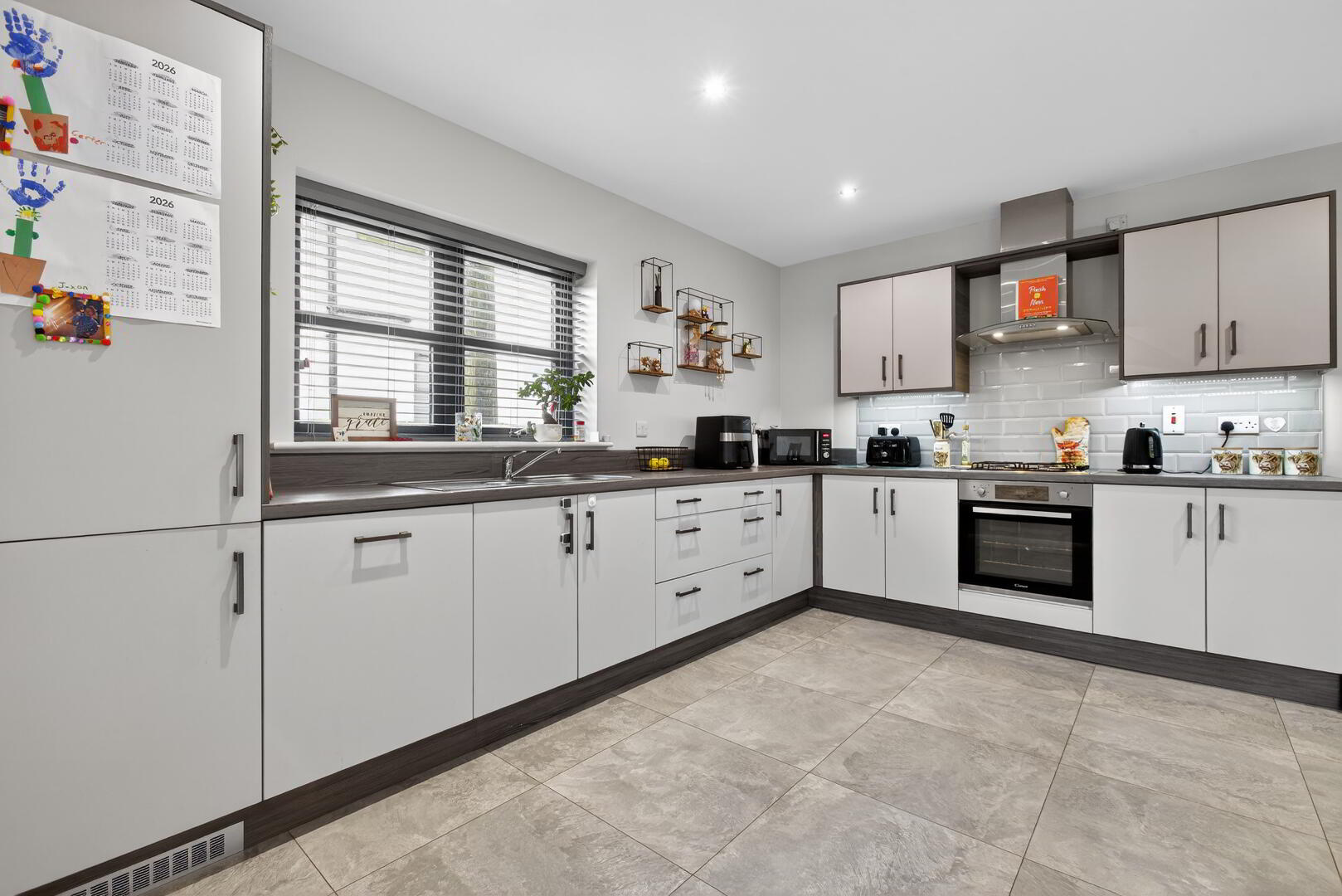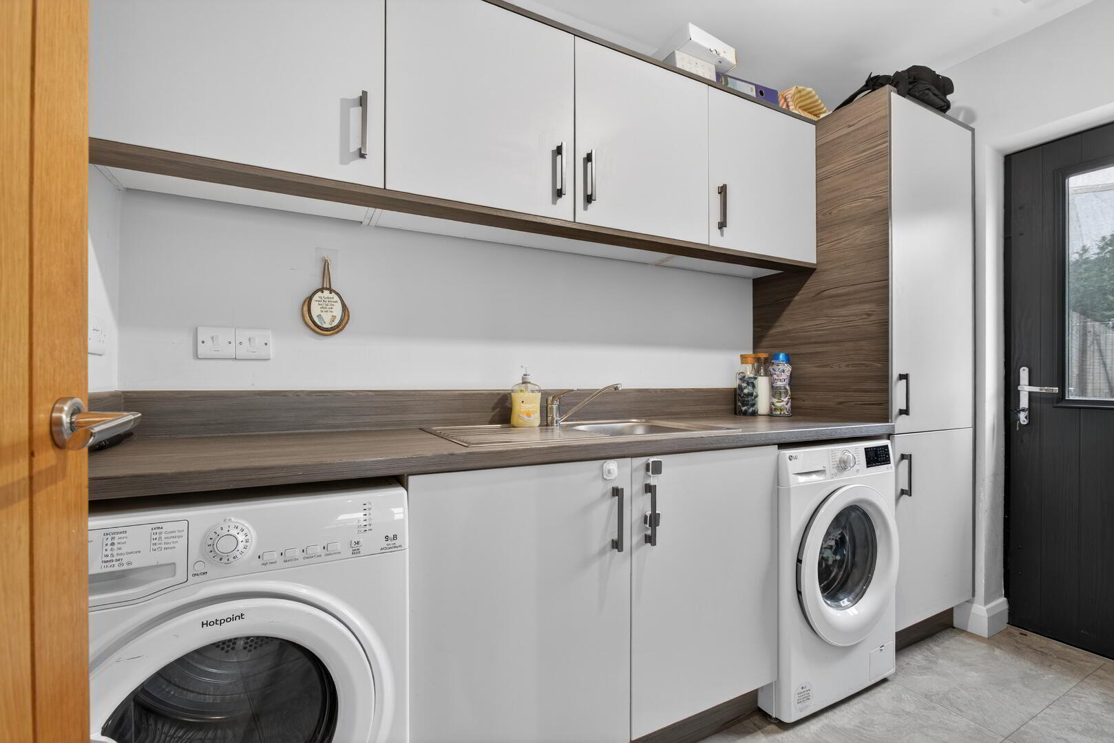With complimentary range of high and low level units and worktops including space for washing machine and tumble dryer, stainless steel sink and drainer unit and mixer tap, composite door to rear garden, tiled flooring