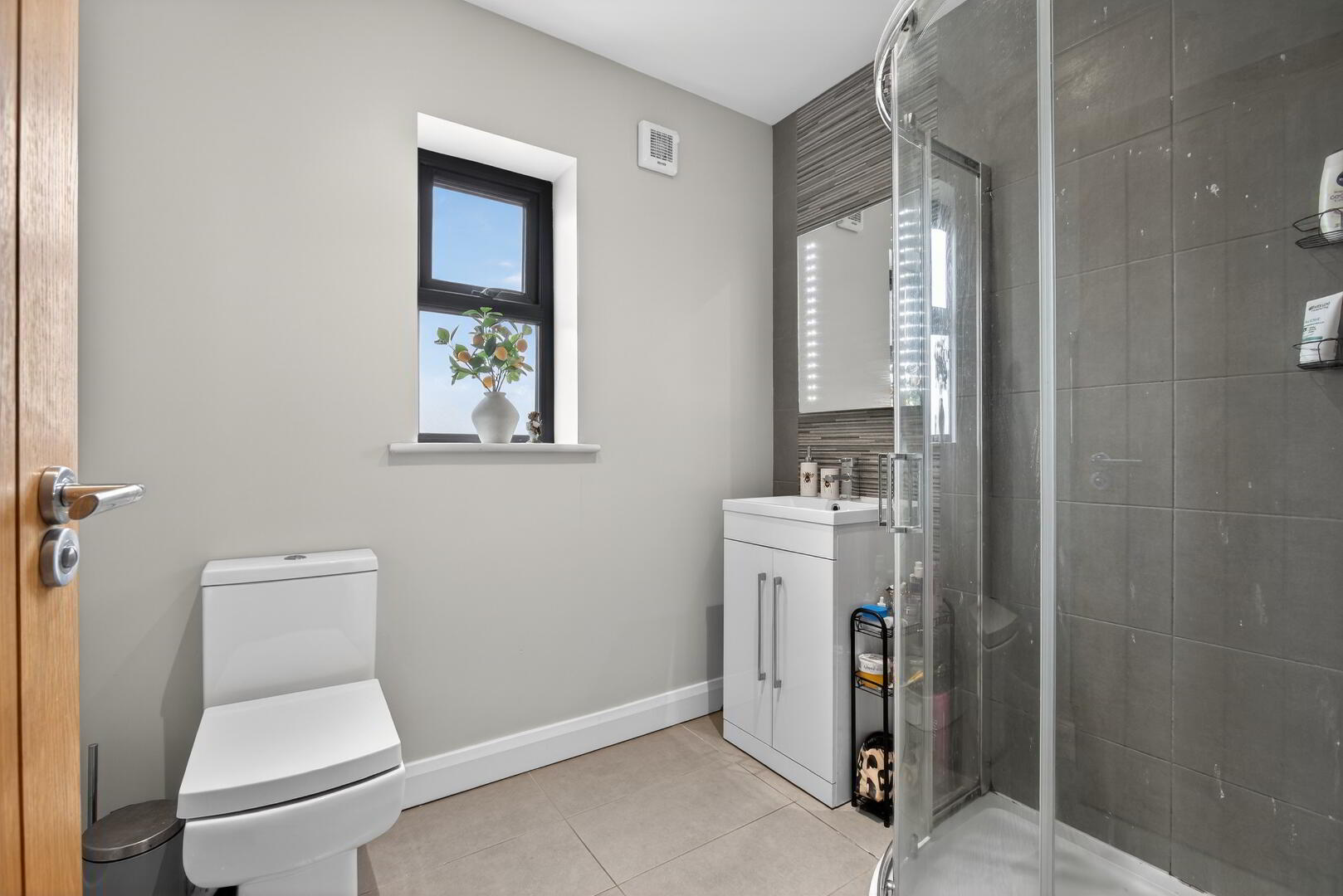 Low flush wc, wash hand basin set on vanity unit with mixer tap, quadrant shower cubicle with thermostatic hand held and rainfall shower unit, tiled flooring, part tiled walls, triple glazed window to front
