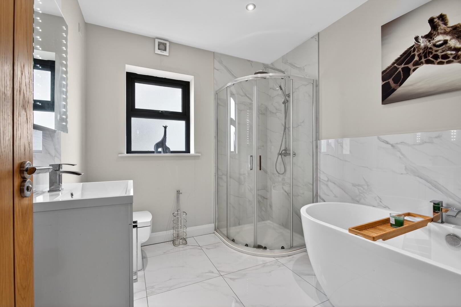 Luxury 4 piece suite comprising of freestanding bath, wash hand basin with mixer tap set on vanity unit, low flush wc, quadrant shower cubicle with rainfall and hand held thermostatic shower, part tiled walls, tiled flooring, chrome radiator towel rail, recessed ceiling lighting, uPVC triple glazed window to side