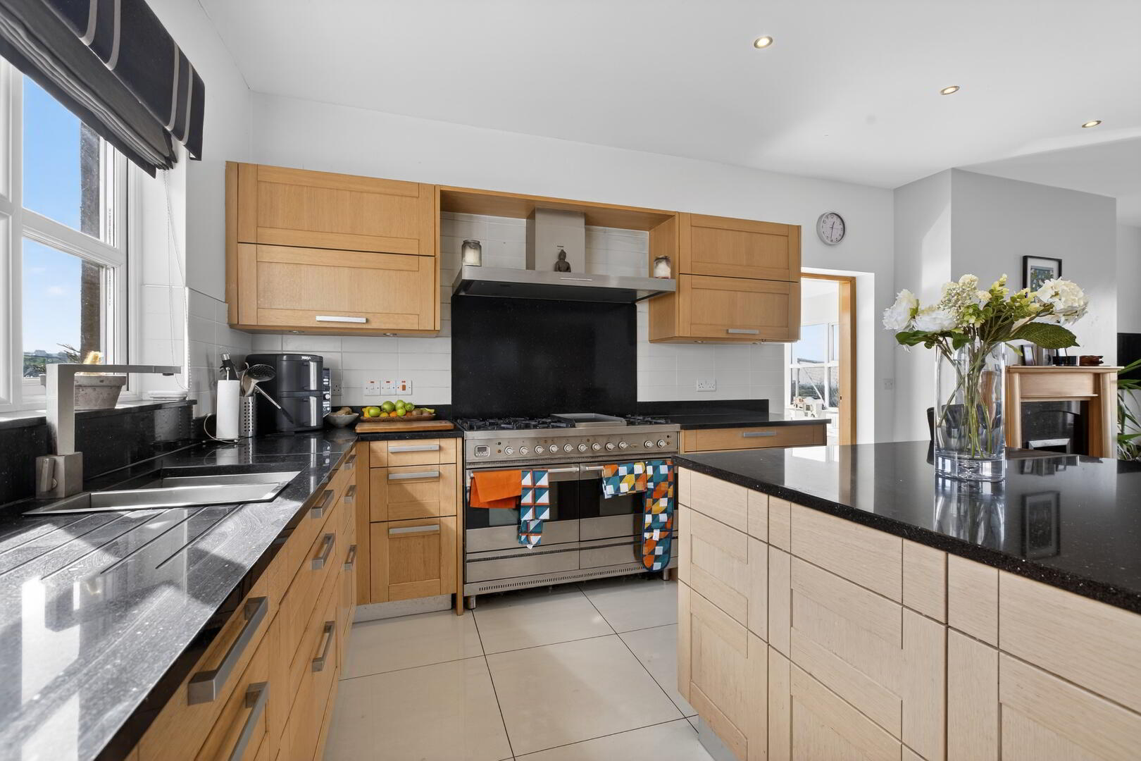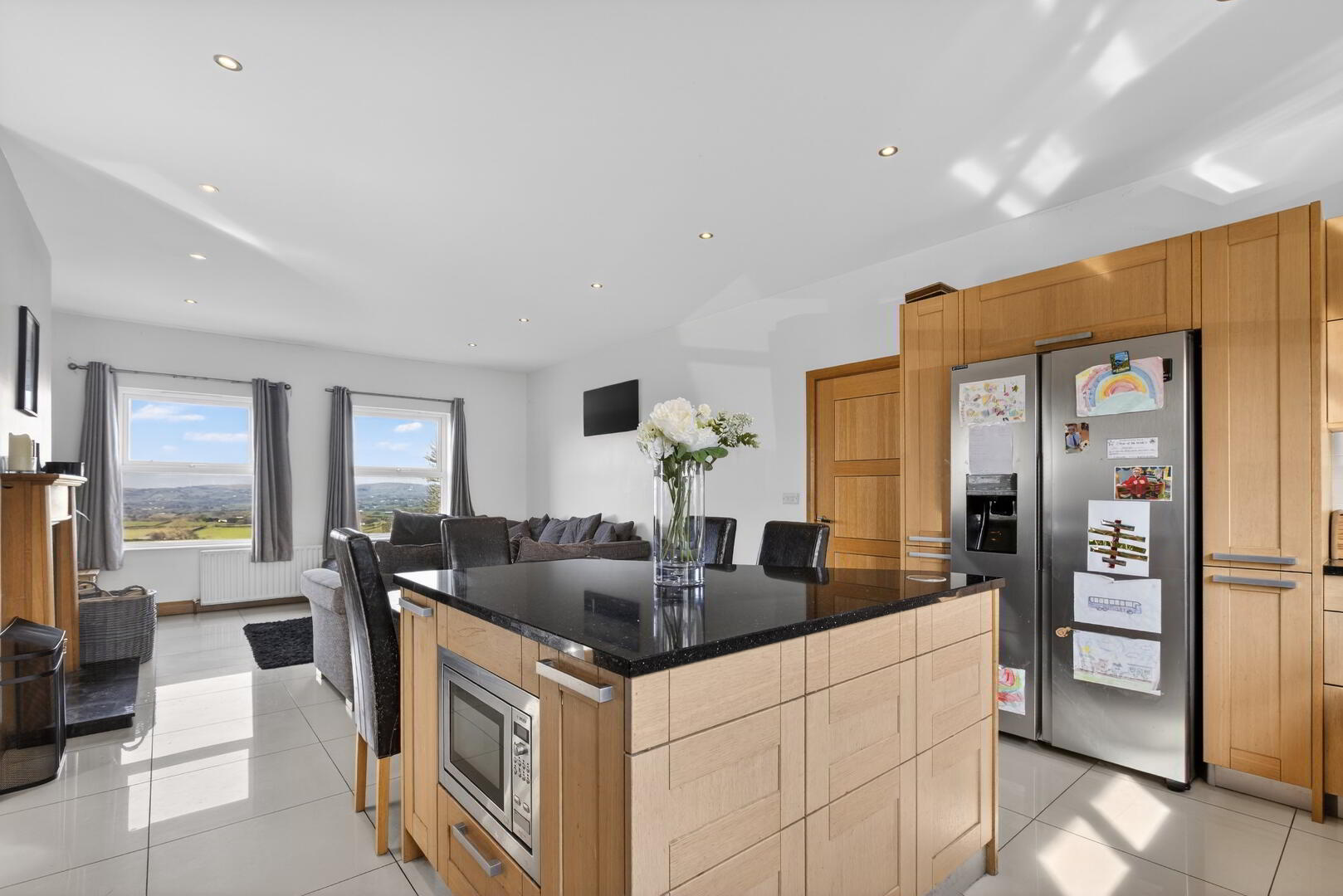 Fitted kitchen in oak finish shaker style units with granite work surface and upstands, space for range style cooker with granite splashback, stainless steel canopy and extractor with pull out larder cupboards to either side, space for American style fridge freezer, integrated dishwasher, inset 1 1/2 bowl sink unit and mixer tap, etched draining board, under unit lighting, tiered island unit with seating for up to four and including additional storage and cupboards and integrated microwave, partly tiled walls, open fireplace with oak finish surround, granite inset and hearth, TV and telephone point, tiled flooring extending through to;