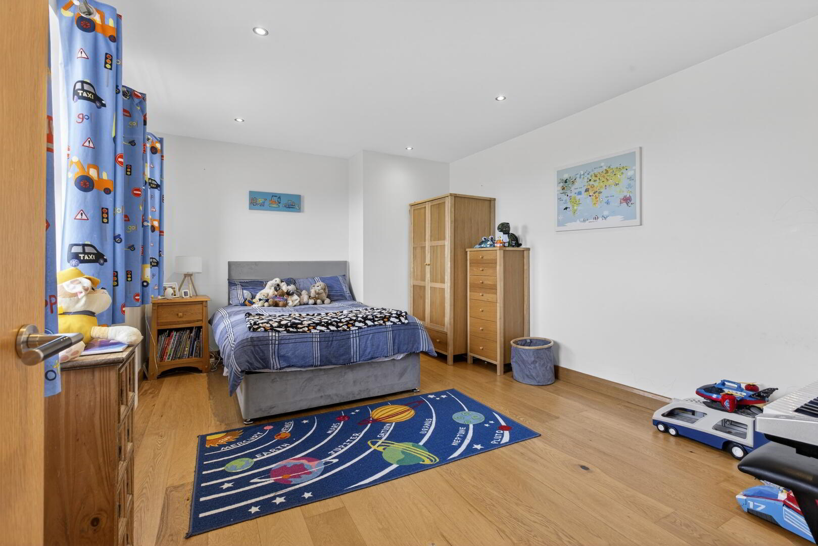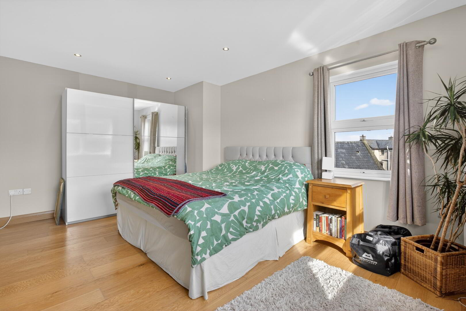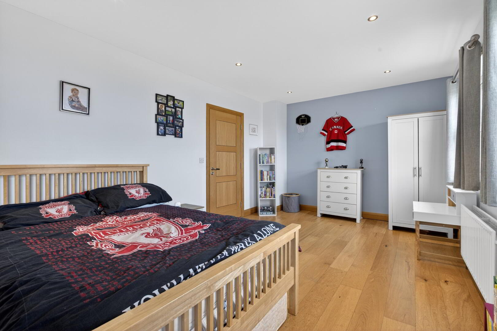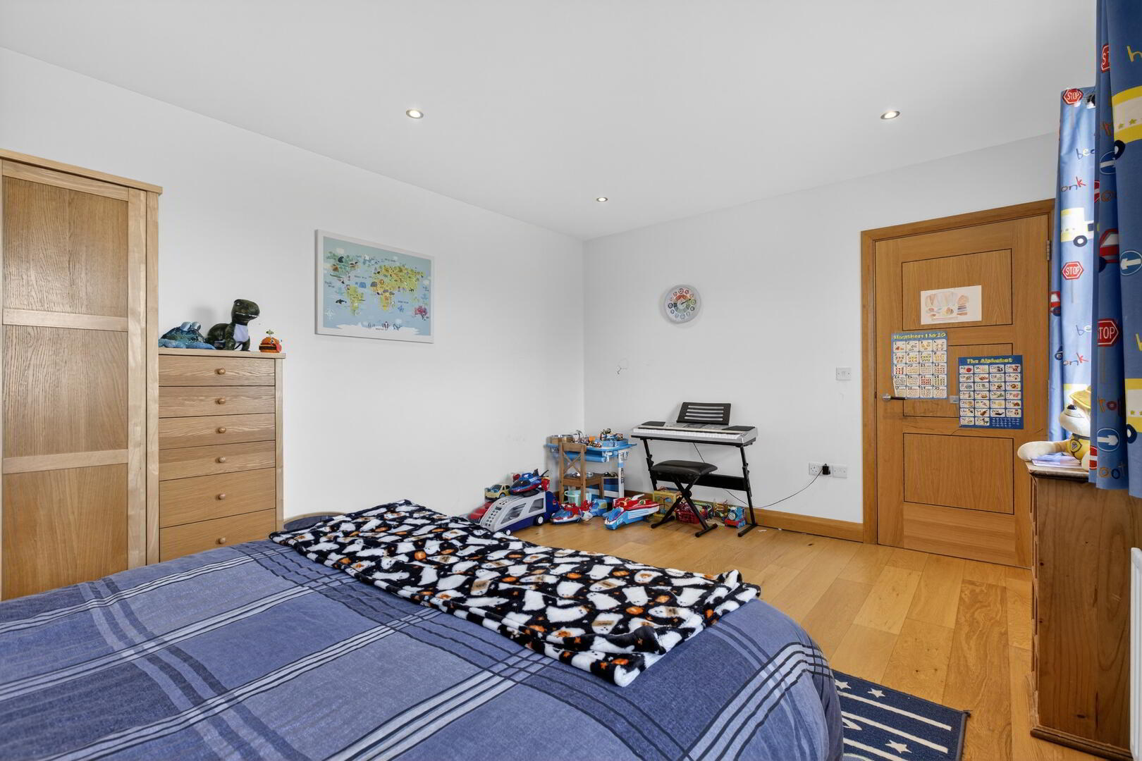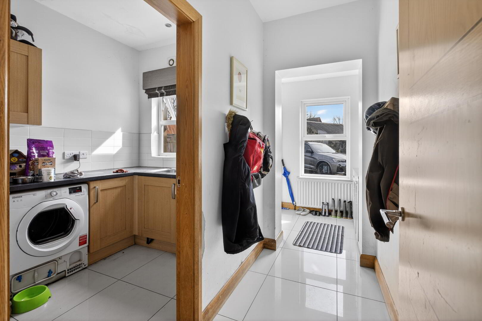 With shelved storage cupboard, hotpress (shelved), integrated spotlights, wide plank oak effect flooring extending through