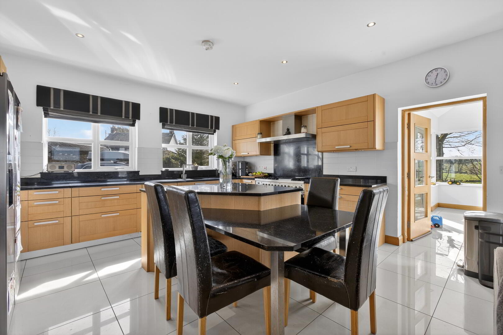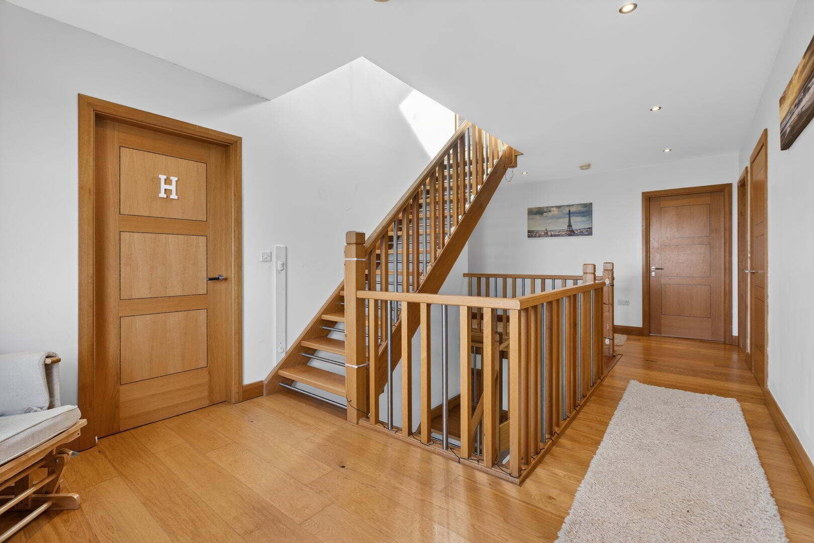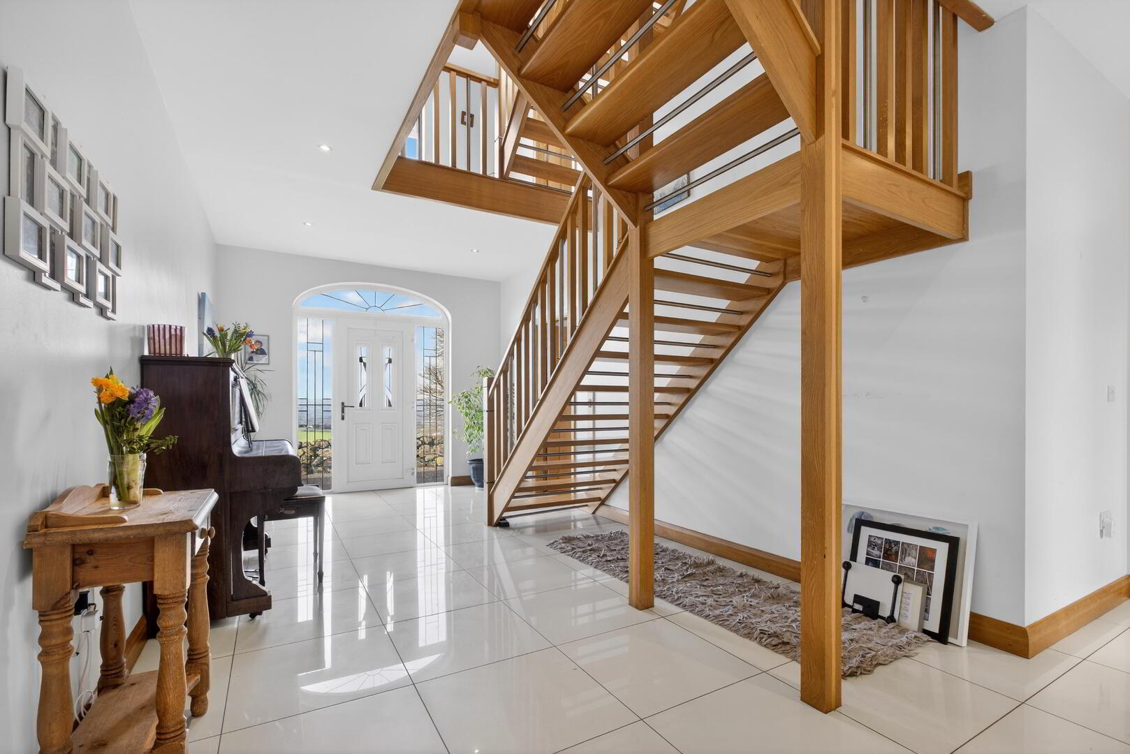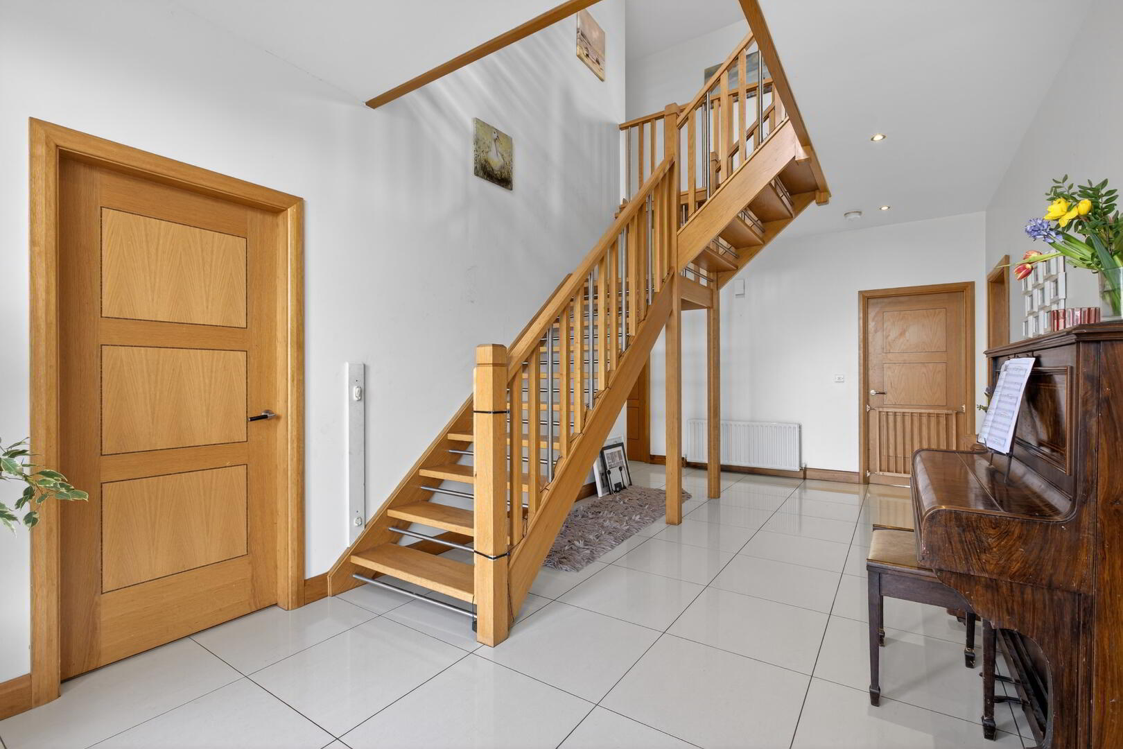 With porcelain tiled flooring extending through, recessed spotlights, open tread oak and brushed chrome effect staircase