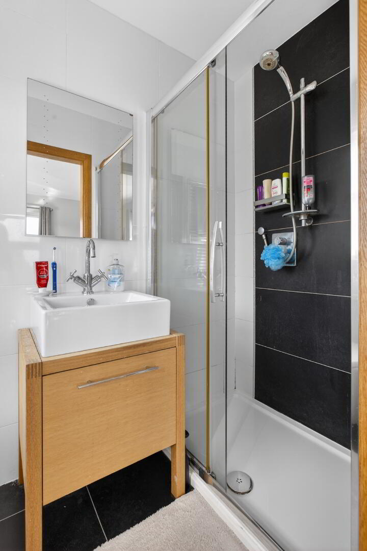 Fully tiled and comprising shower cubicle with shower unit off mains, vanity unit with counter top basin and mixer tap, mirror above, back to wall low flush wc, heated towel rail