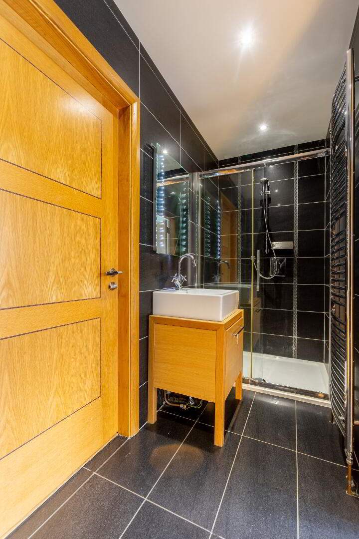 Fully tiled and comprising shower cubicle with shower unit off mains, vanity unit with counter top basin and mixer tap, mirror above with lighting, back to wall low flush wc, heated towel rail, integrated spotlights, tiled flooring