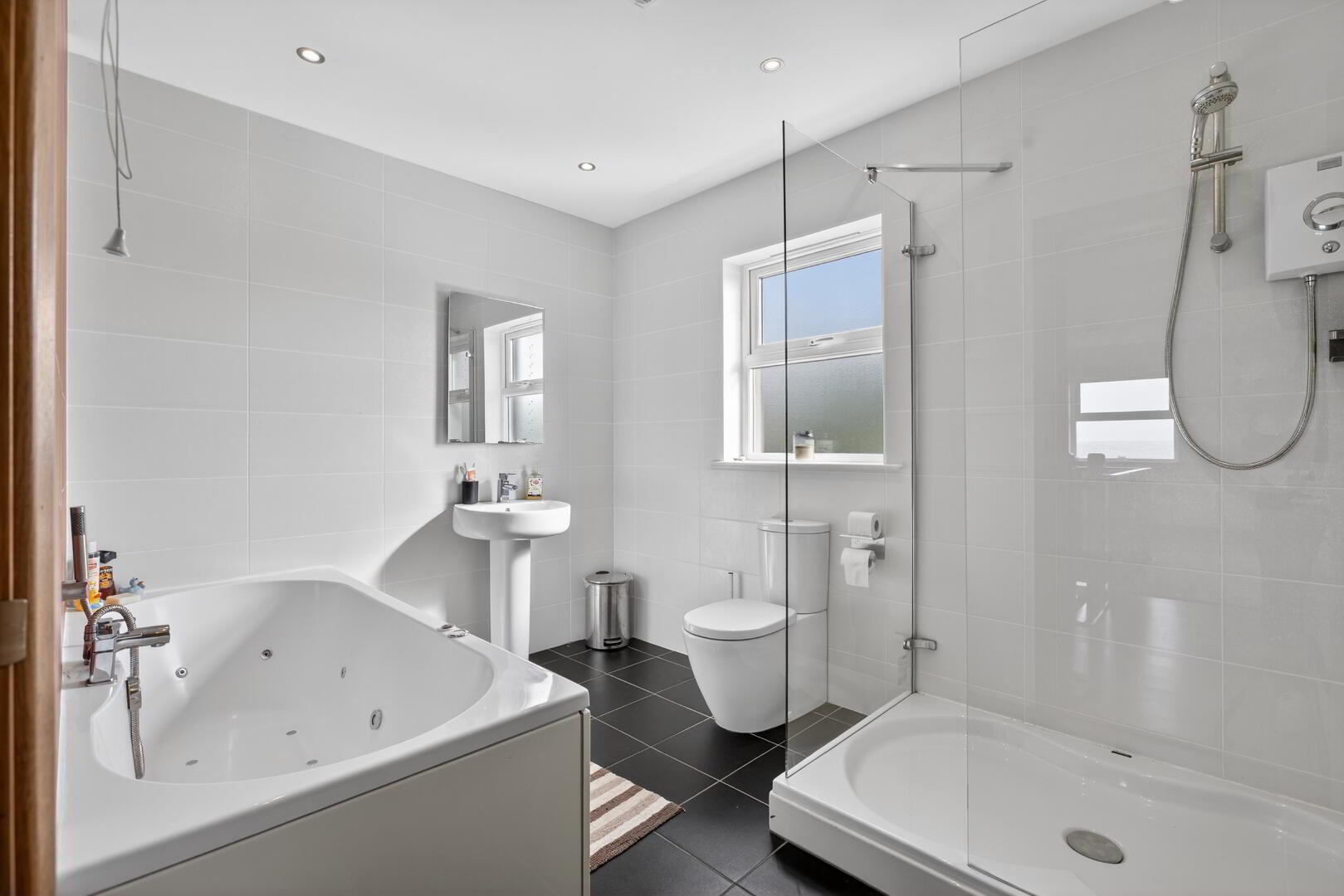 With tiled walls and comprising walk in shower cubicle with shower unit, spa jet bath with mixer tap and separate hand shower set, pedestal wash hand basin with mixer tap, back to wall low flush wc, integrated spotlights, tiled flooring