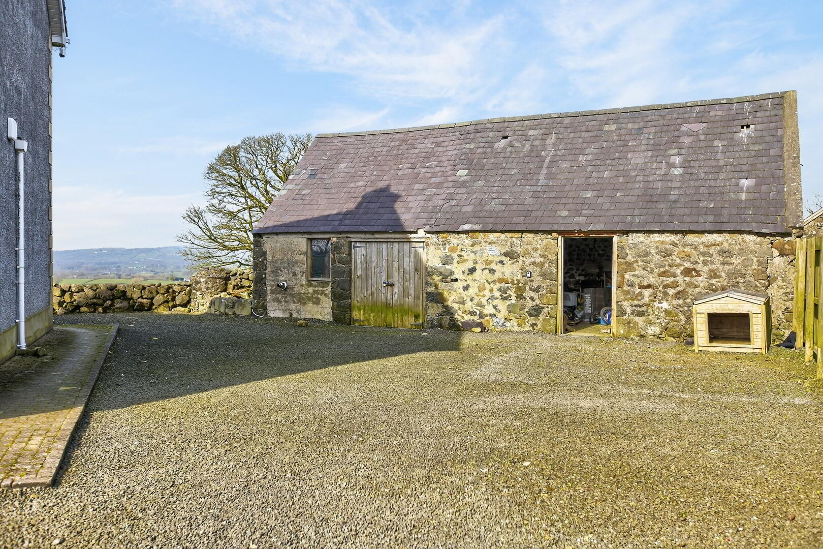 Shared access from road and entering to grounds of property and including detached traditional stone outhouse, split into 2 sections;