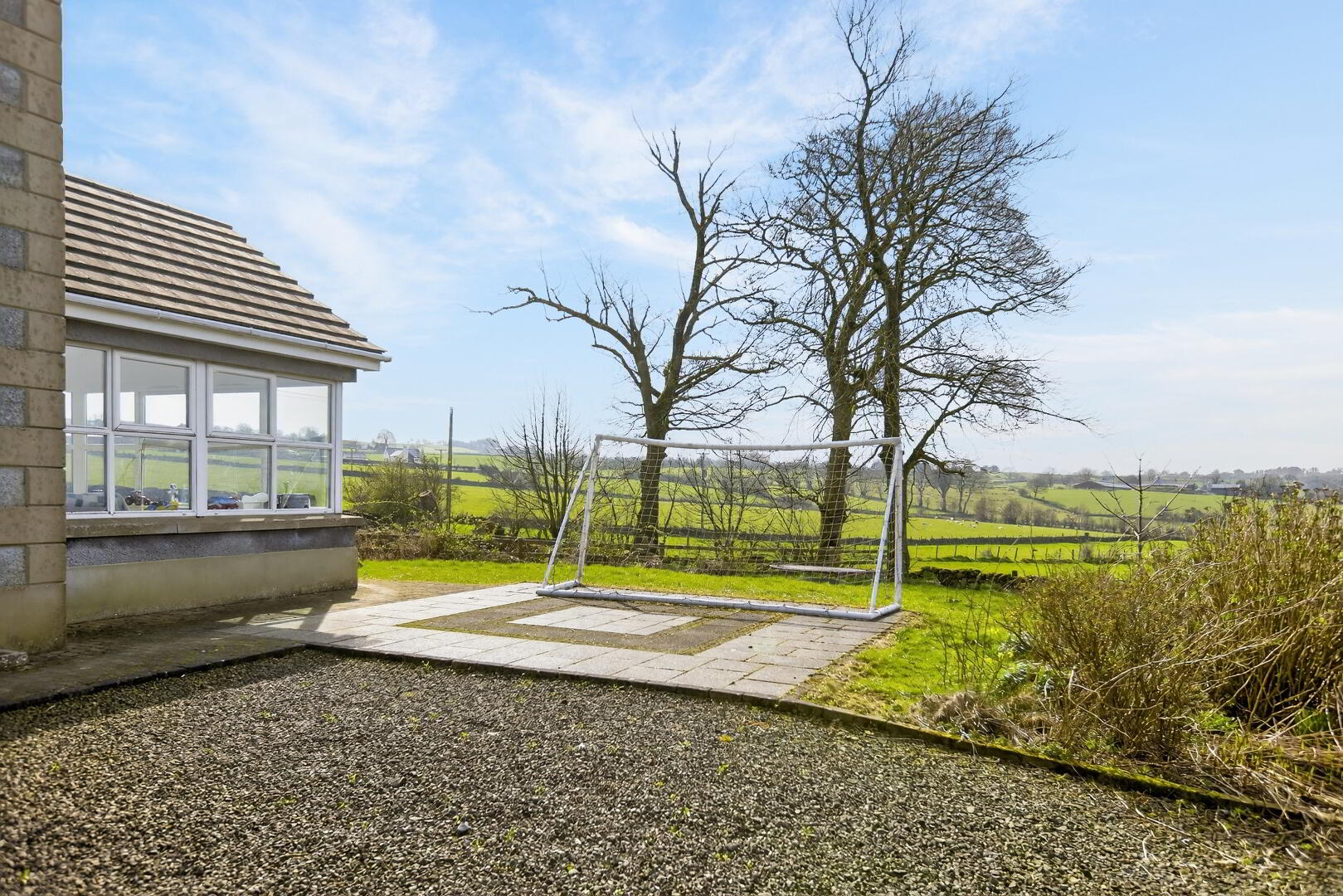 Paved patio area leading to lawned area
