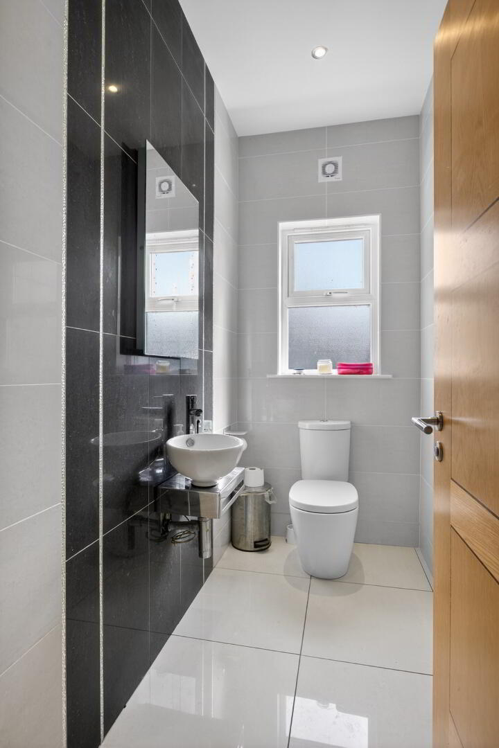 With fully tiled walls and comprising of wall hung metal ledge with counter top basin and mixer tap, mirror above with lighting, low flush wc, heated towel rail, recessed spotlights