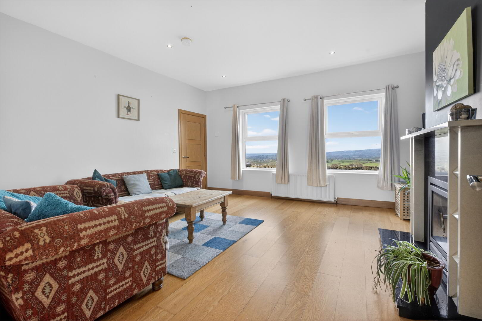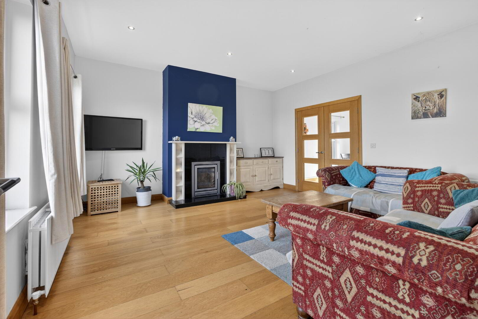 Fireplace with granite surround, inset and hearth, glass fronted enclosed fire, TV point, recessed spotlights, wide plank oak finish flooring extending through to;