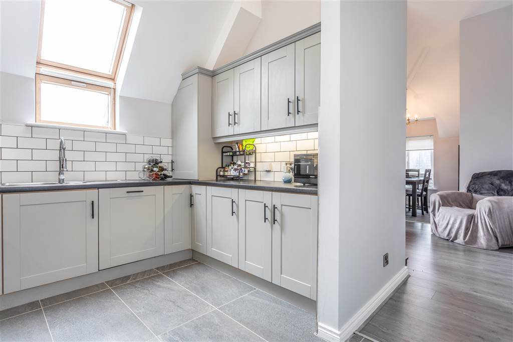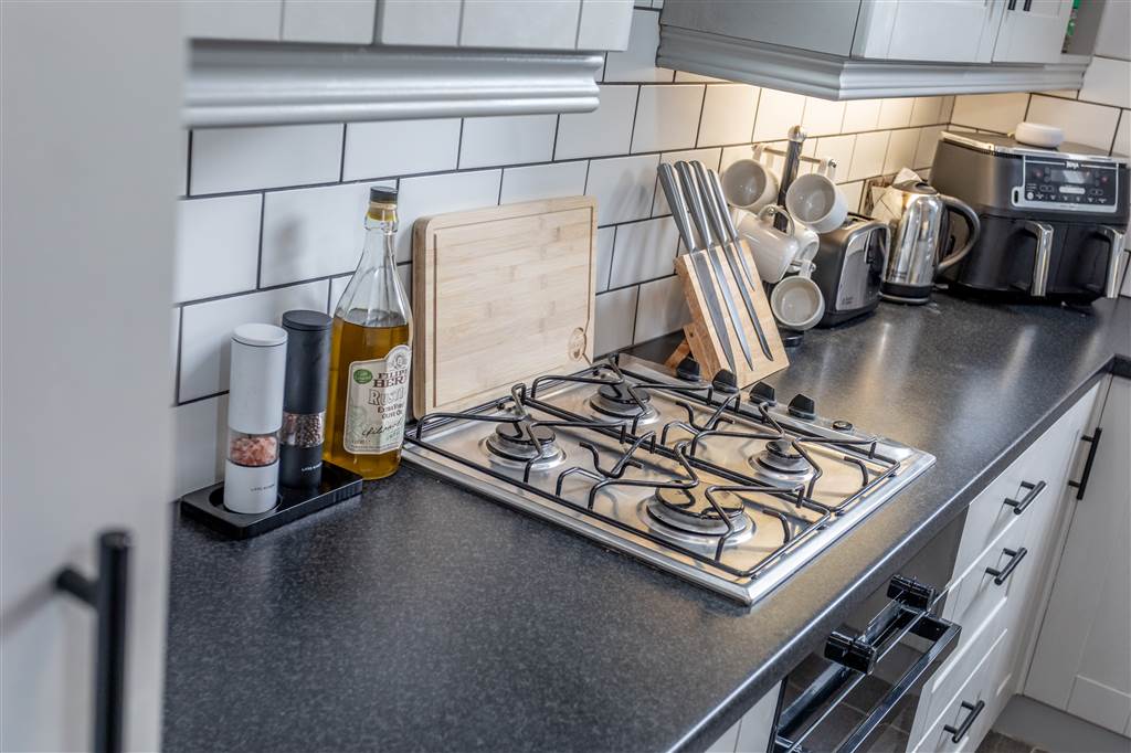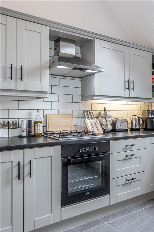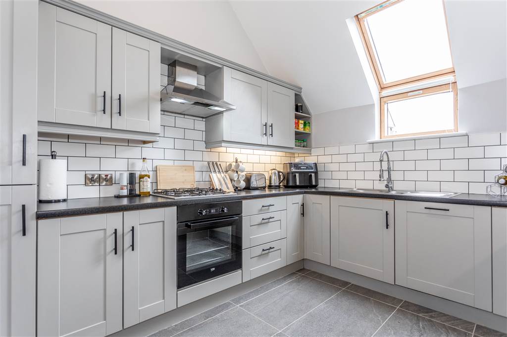 With a range of eye and low-level fitted units, 1 1/4 bowl stainless-steel sink unit and drainer with stainless-steel mixer tap. Integrated four ring gas hob and oven with stainless-steel extractor fan over. Integrated fridge-freezer. Integrated dishwasher. Cutlery drawer. Saucepan drawers. Velux window. Splash back tiling. Tiled flooring.