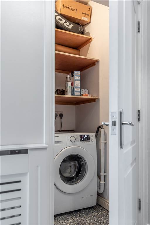 Plumbed for washing machine. Space for tumble dryer. Shelved storage.