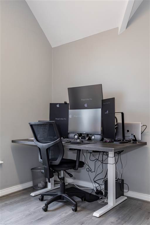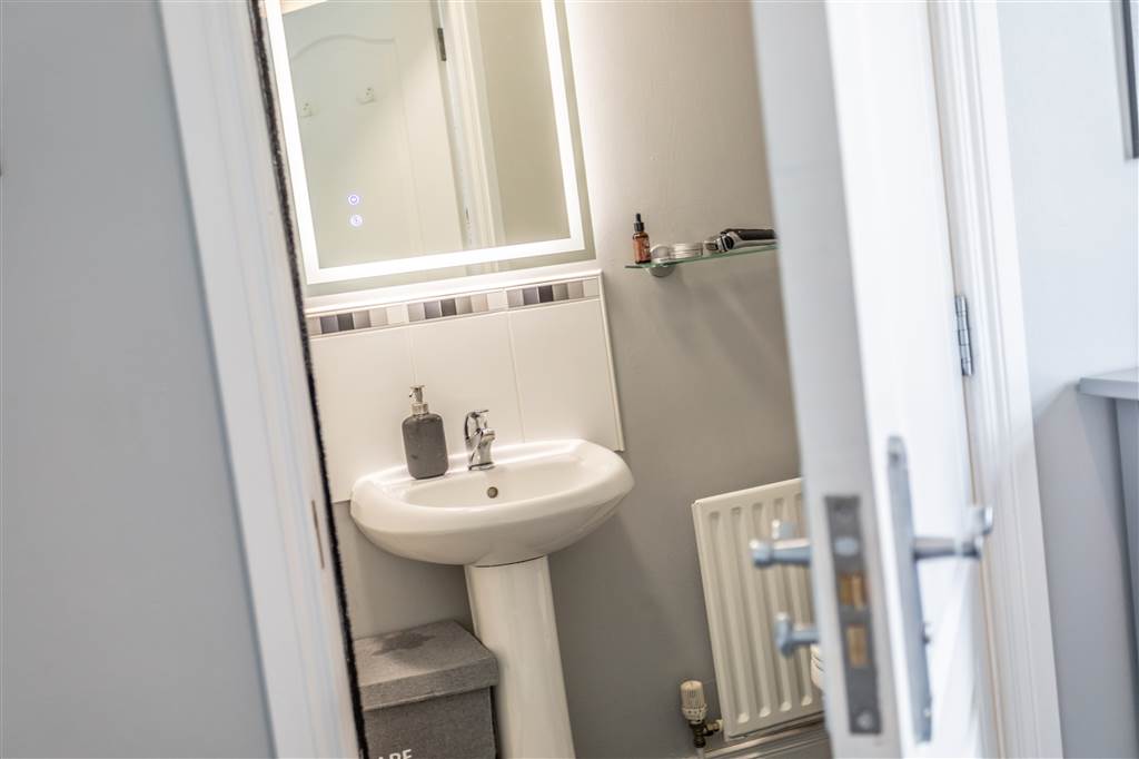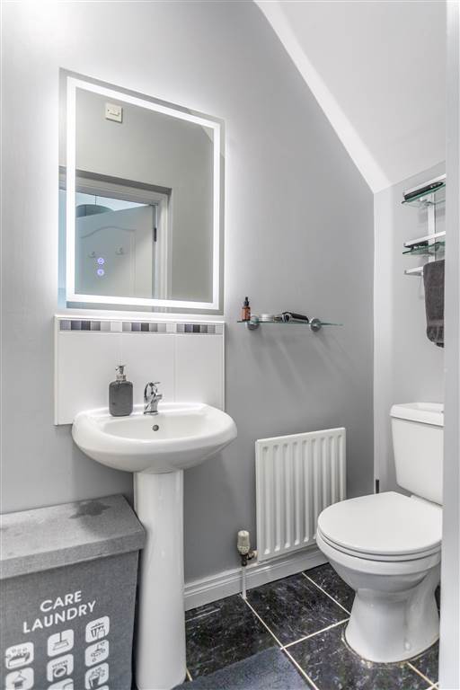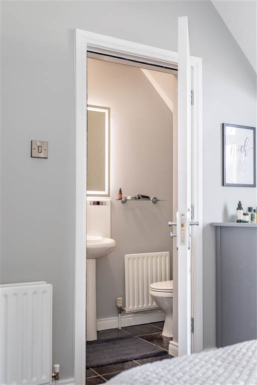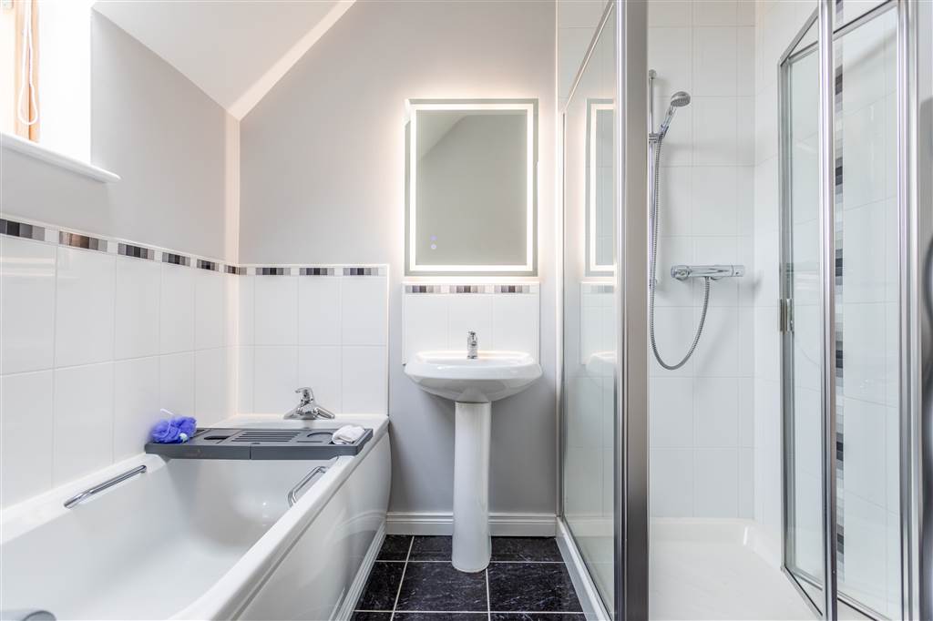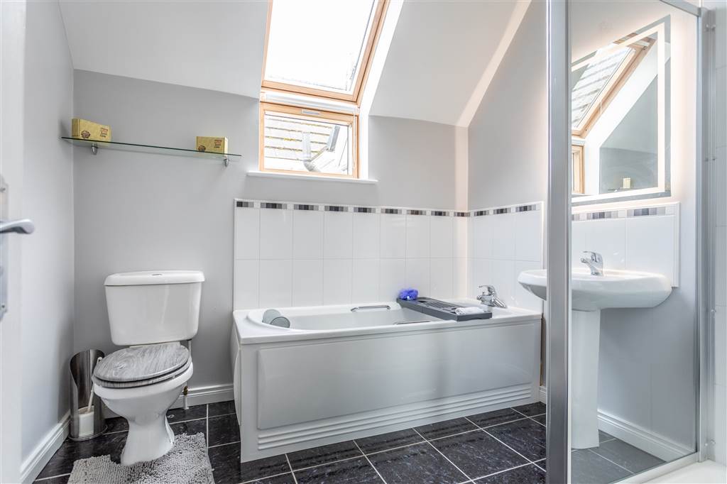 4-piece white suite comprising LFWC, WHB, panelled bath and shower to enclosed tiled corner cubicle. Velux window. Splash back tiling. Tiled flooring.
