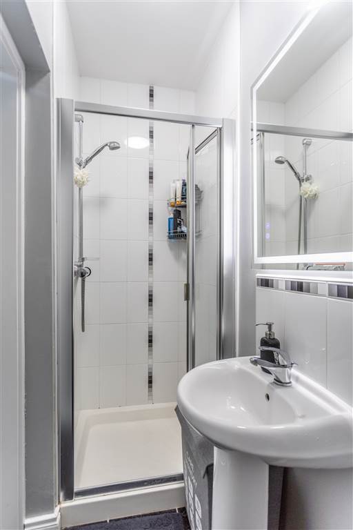 3-piece white suite comprising LFWC, WHB and shower to enclosed tiled cubicle. Splash back tiling. Tiled flooring.