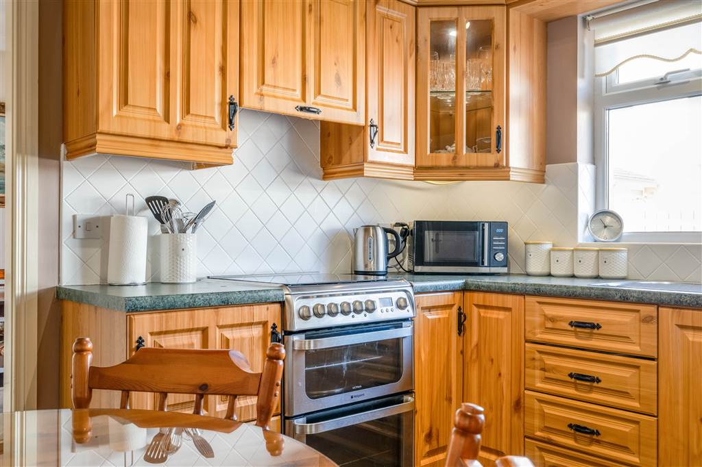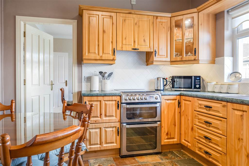 With a range of eye and low-level fitted units, 1 1/4 bowl stainless-steel sink unit and drainer with stainless-steel mixer tap. Space for four ring electric hob and oven with extractor fan over. Space for fridge-freezer. Cutlery drawers. Glazed display cupboards. Under cabinet lighting. Splash back tiling. Tiled flooring.