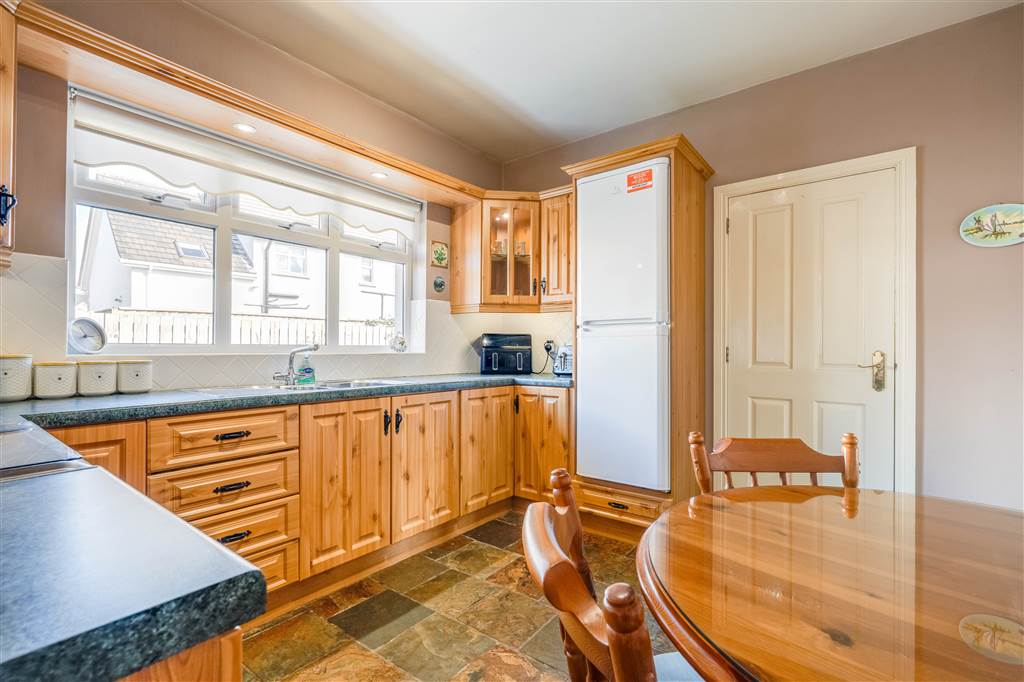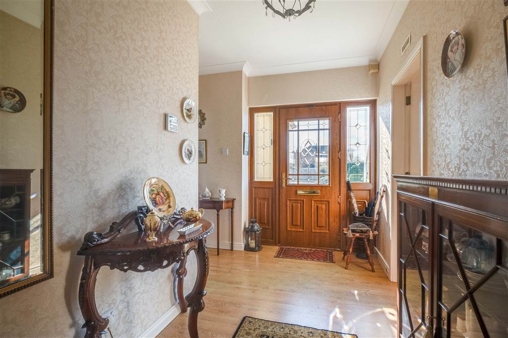 With composite front door with decorative glazed pane and decorative glazed side panes. Hot-press with shelved storage. Access to loft. Coving to ceiling. Laminated wooden flooring.
