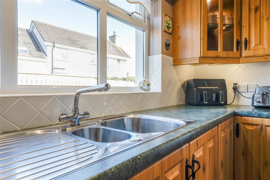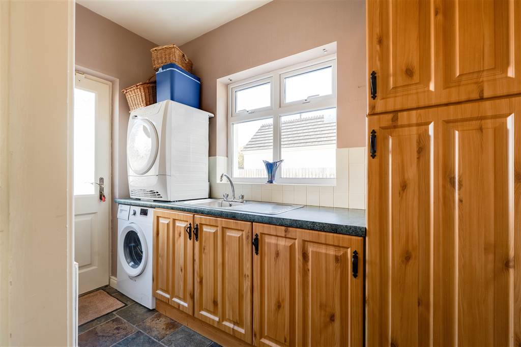 With fitted units, stainless-steel sink unit and drainer with stainless-steel mixer tap. Plumbed for washing machine. Splash back tiling. Tiled flooring. Hardwood door to rear.