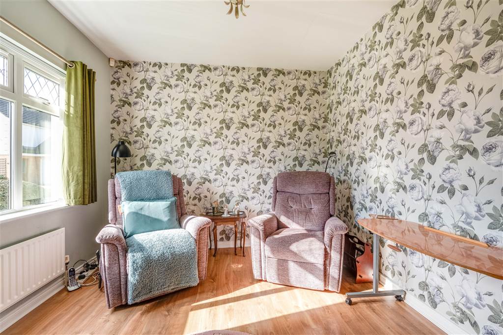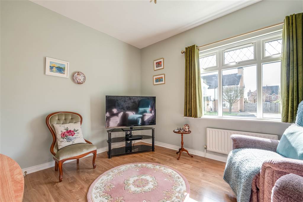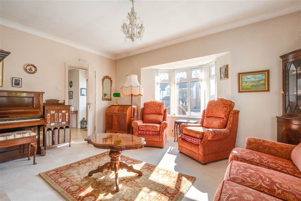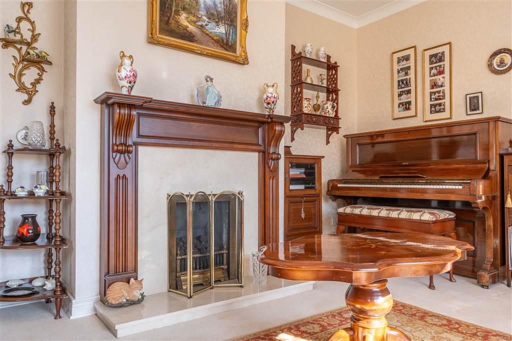 With fireplace to marble hearth, wooden surround and mantle. Bay window. Coving to ceiling.