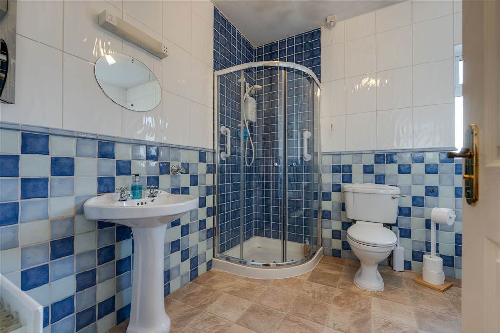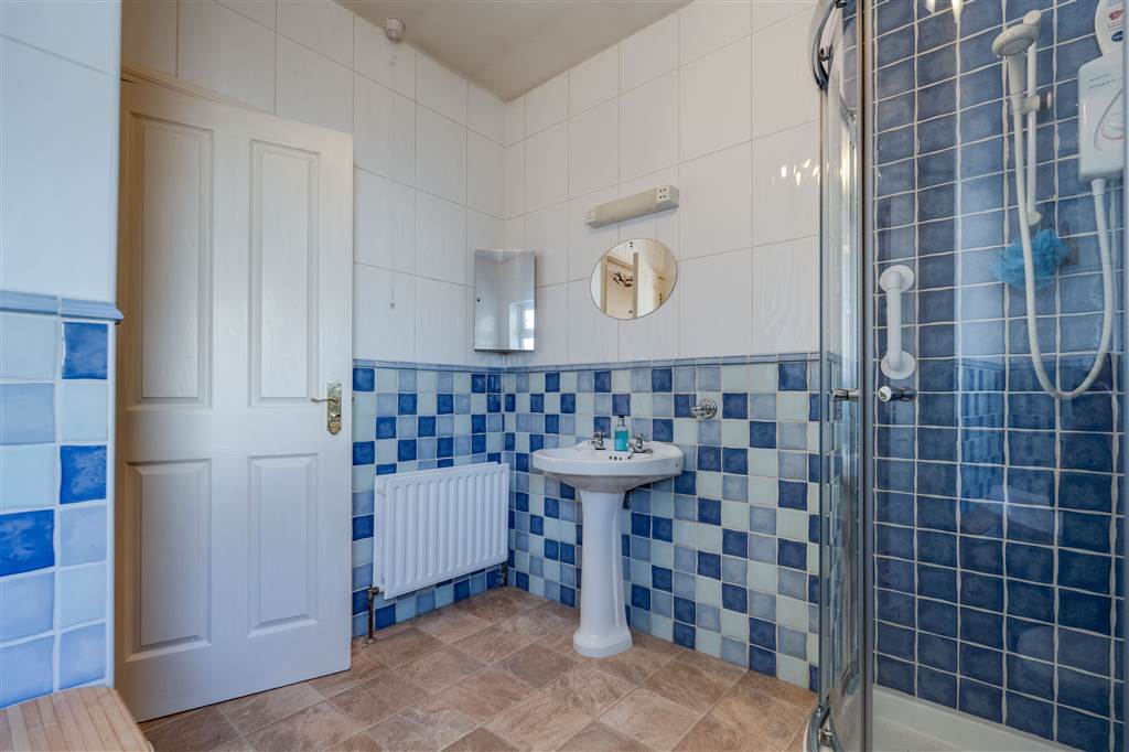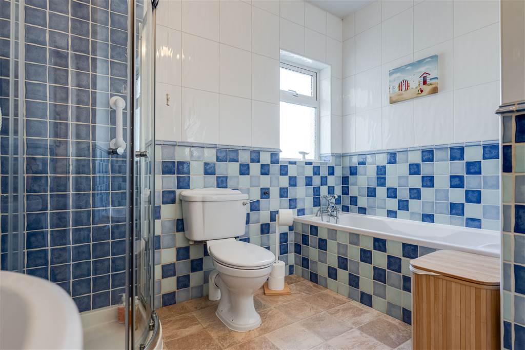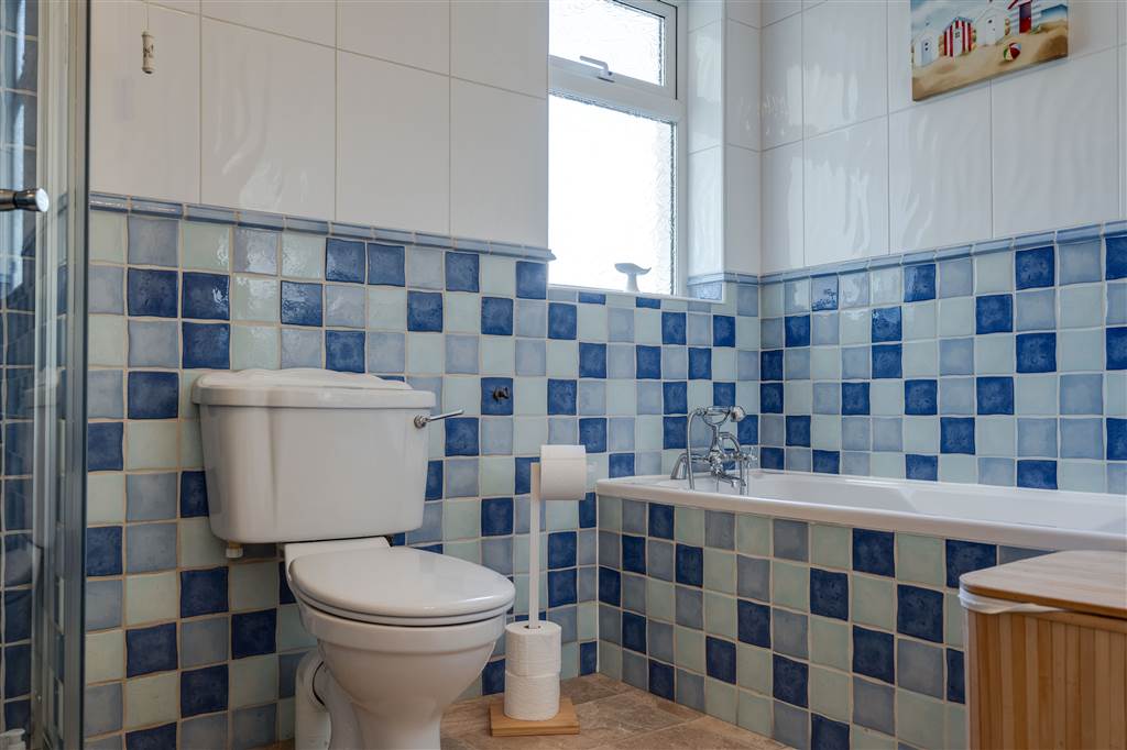 With 4-piece white suite comprising LFWC, WHB, panelled bath with telephone style shower head and shower to enclosed tiled corner cubicle. Tiled walls.