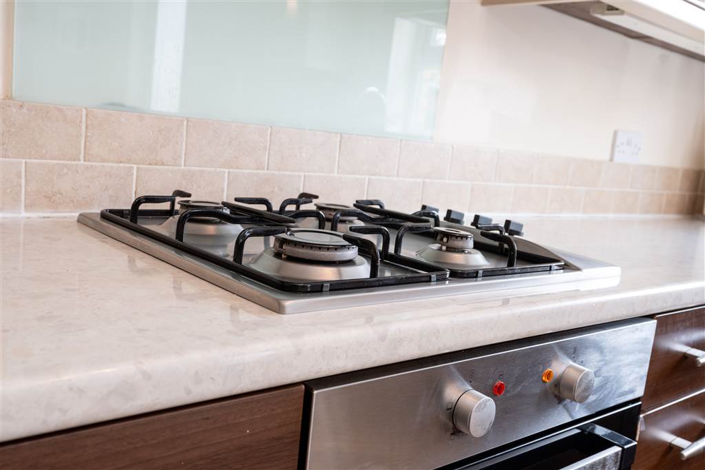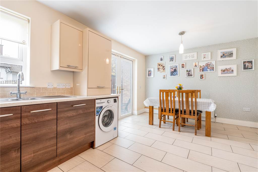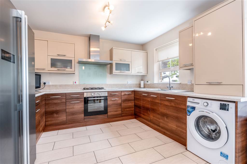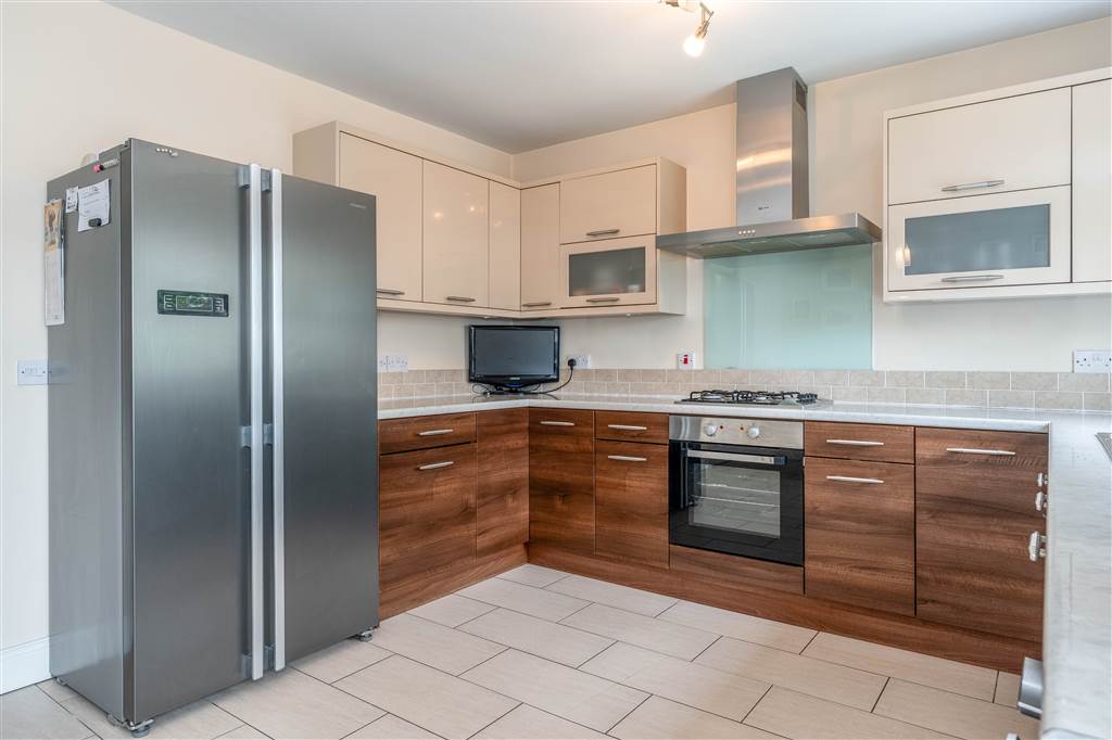 With a range of eye and low-level fitted units, 1 1/4 bowl stainless-steel sink unit and drainer with stainless-steel mixer tap. Integrated four ring gas hob and electric oven with extractor fan over. Integrated dishwasher. Plumbed for washing machine. Space for American style fridge-freezer. Cutlery drawers. Spacious area for dining. Under cabinet lighting. Splash back tiling. Tiled flooring. PVC double doors to rear.