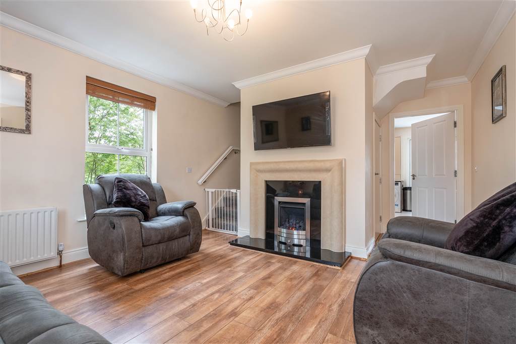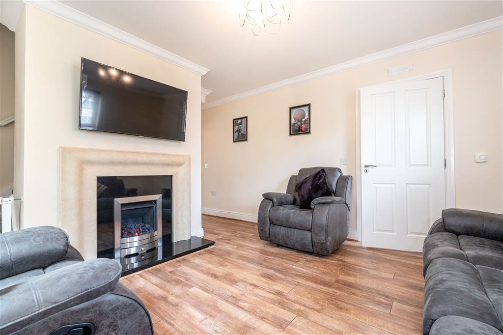 With gas fire to granite hearth, stone surround and mantle. Staircase to first floor. Under stair storage cupboard. Coving to ceiling. Laminated wooden flooring.