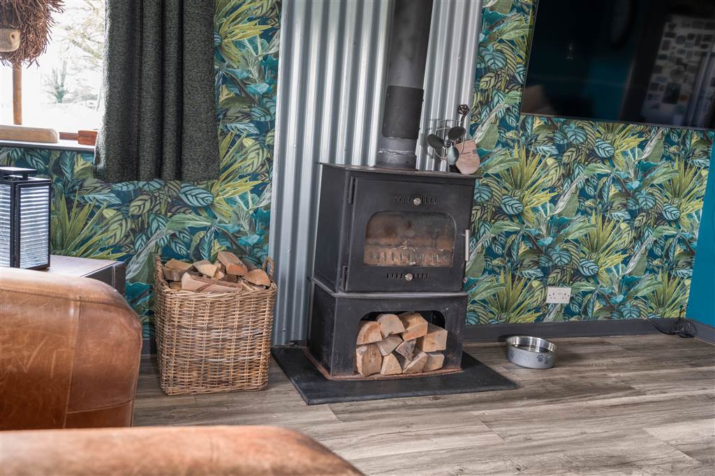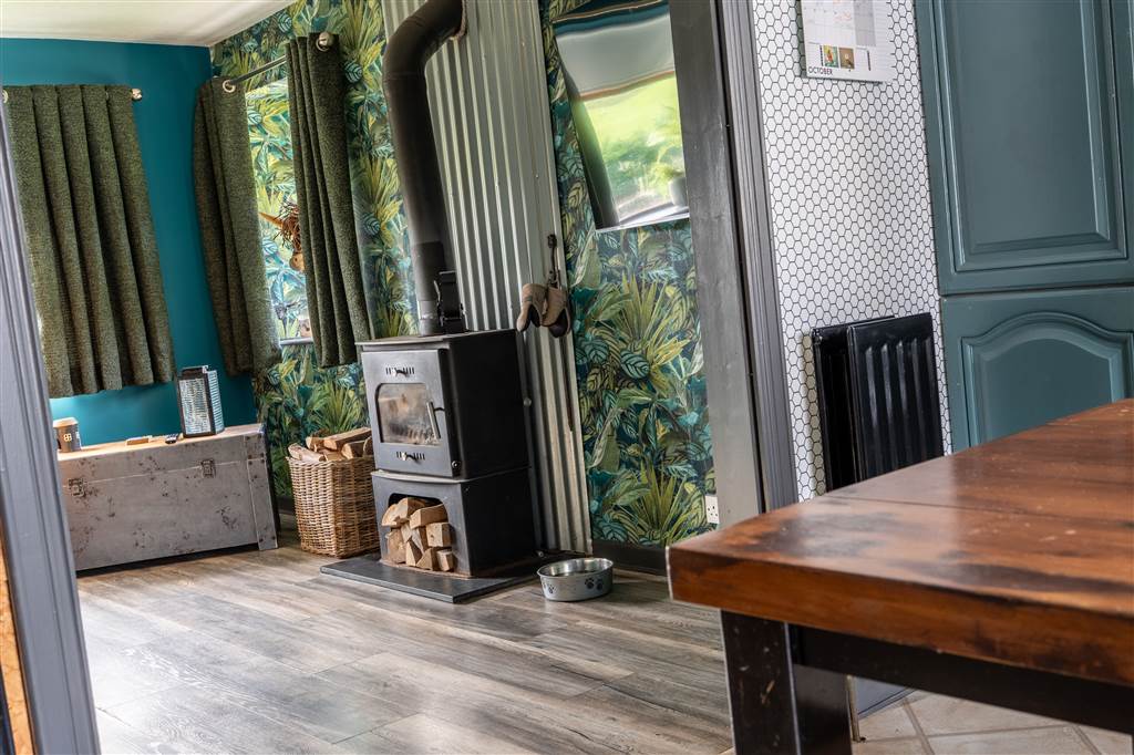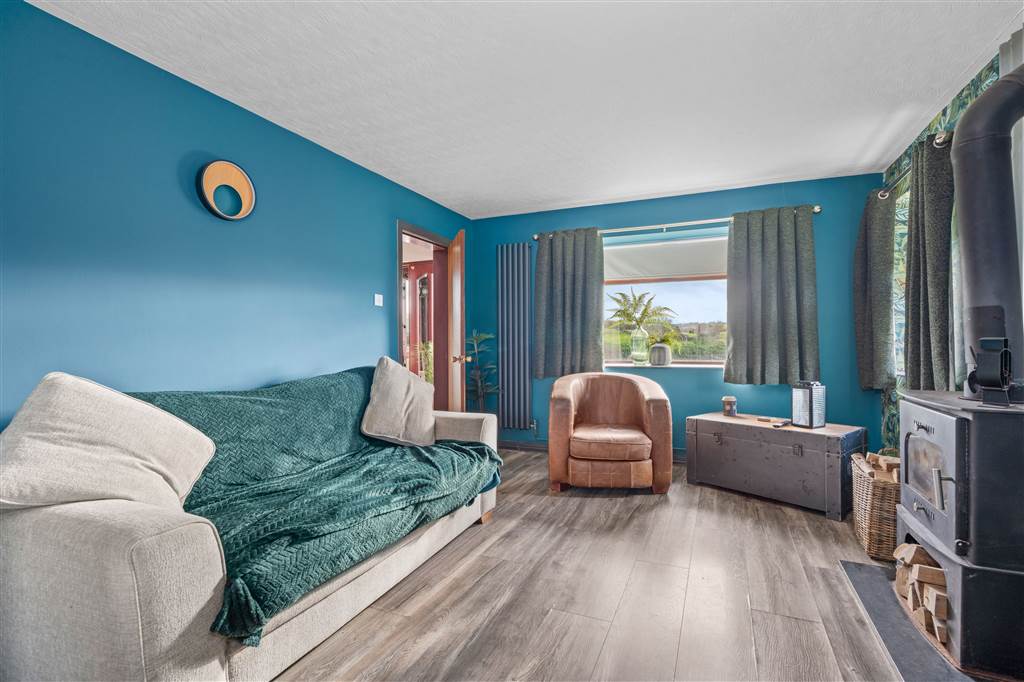 With wood burning stove to slate hearth. Laminated wooden flooring. Archway to kitchen/dining room.
