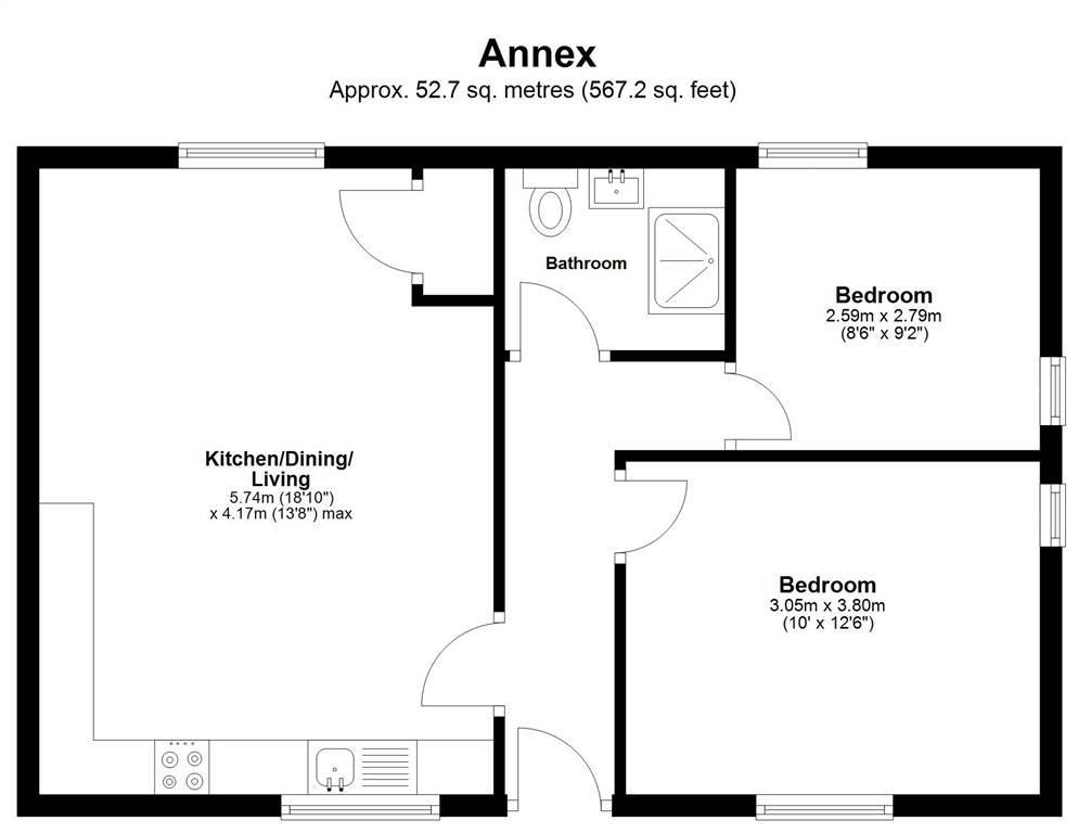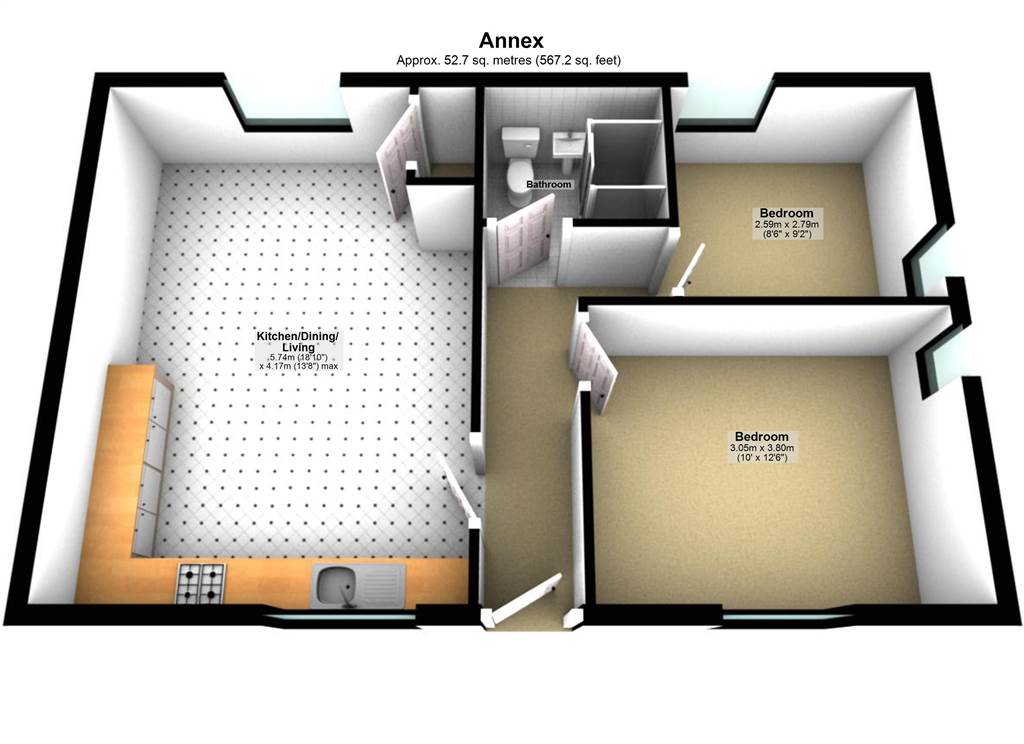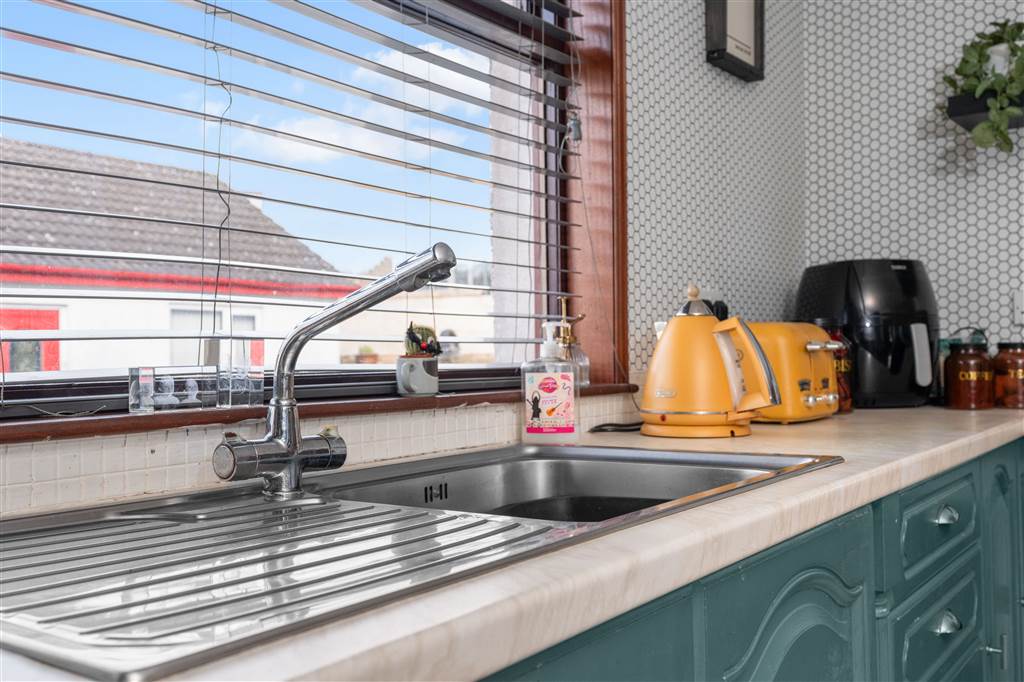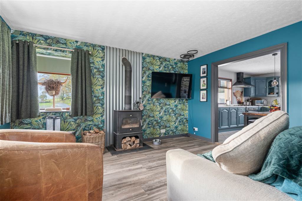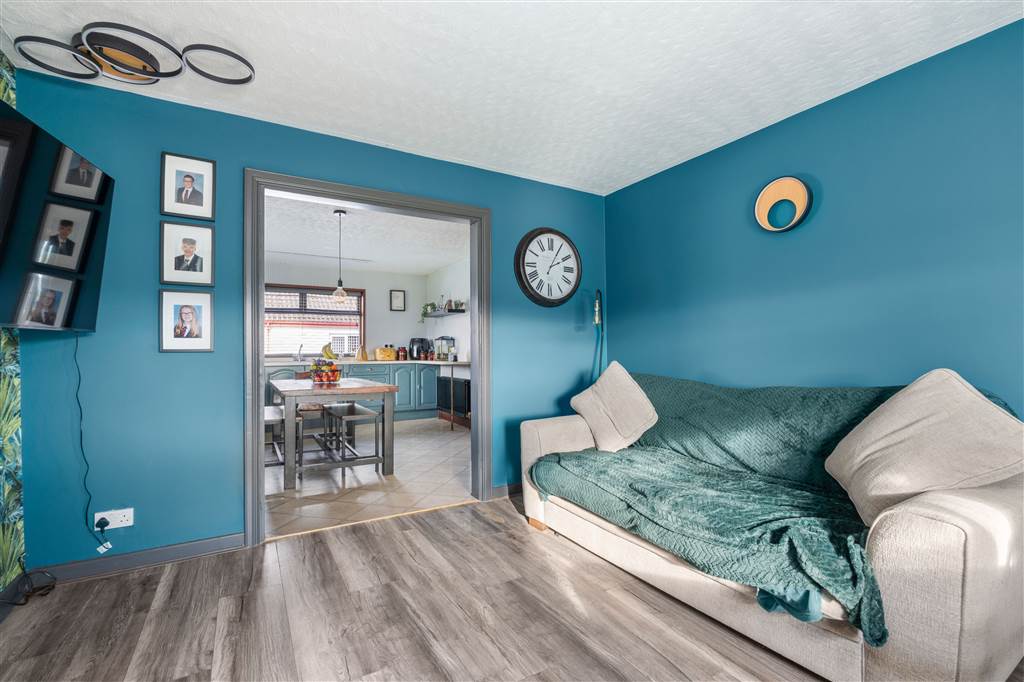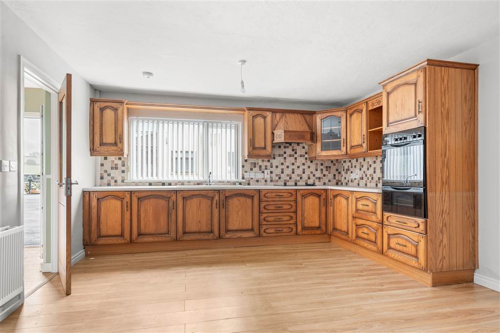 With a range of eye and low-level fitted units, sink unit and drainer with stainless-steel mixer tap. Integrated four ring electric hob with extractor fan over. Integrated oven. Space for fridge-freezer. Cutlery drawers. Saucepan drawers. Glazed display cupboard. Spacious area for living/dining. Splash back tiling. Laminated wooden flooring.