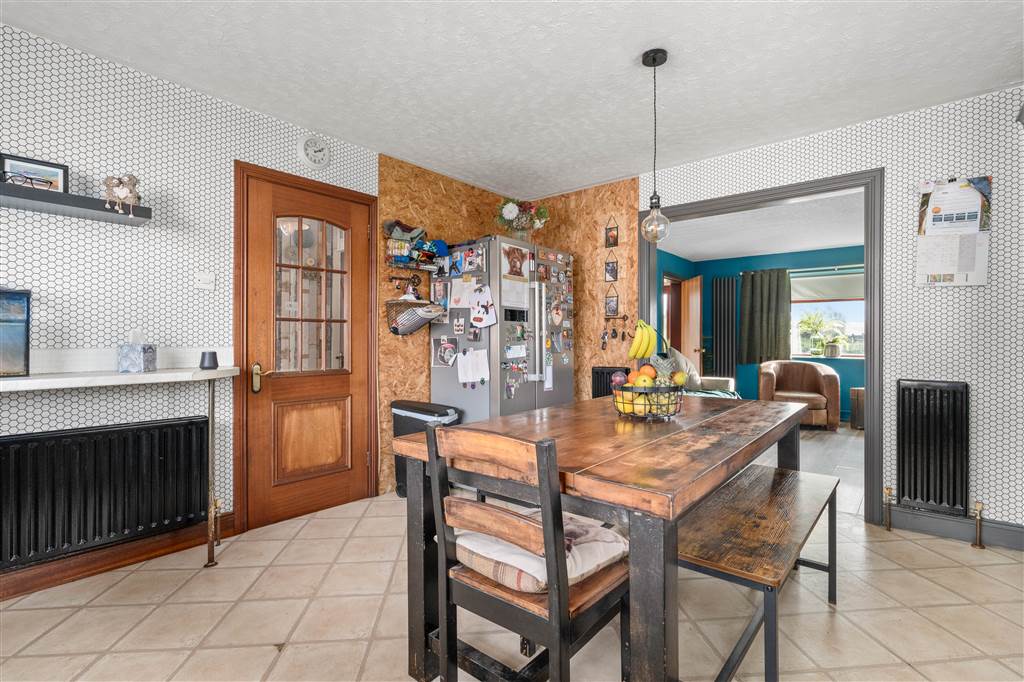 With a range of eye and low-level fitted units, stainless-steel sink unit and drainer with stainless-steel mixer tap. Space for gas hob and electric oven with extractor fan over. Space for American style fridge-freezer. Breakfast bar area. Spacious area for dining. Splash back tiling.