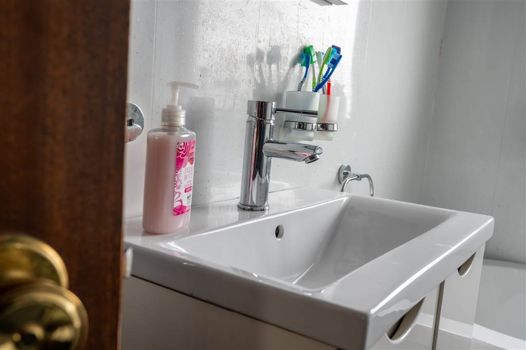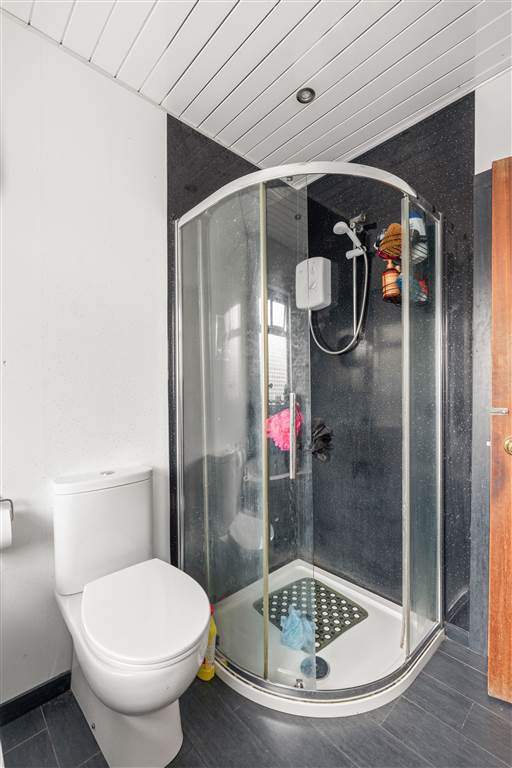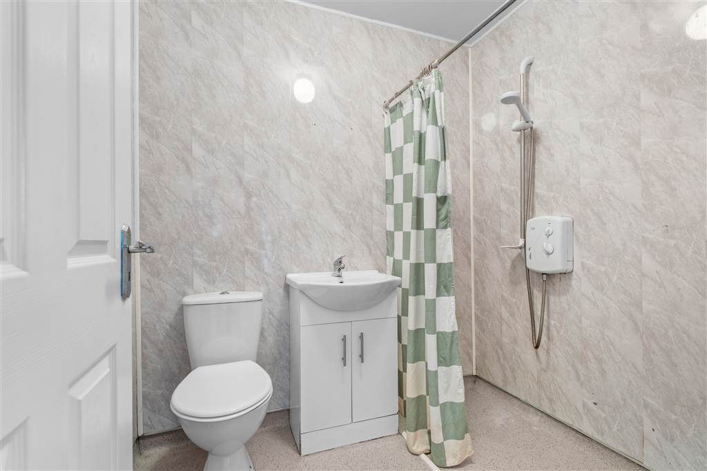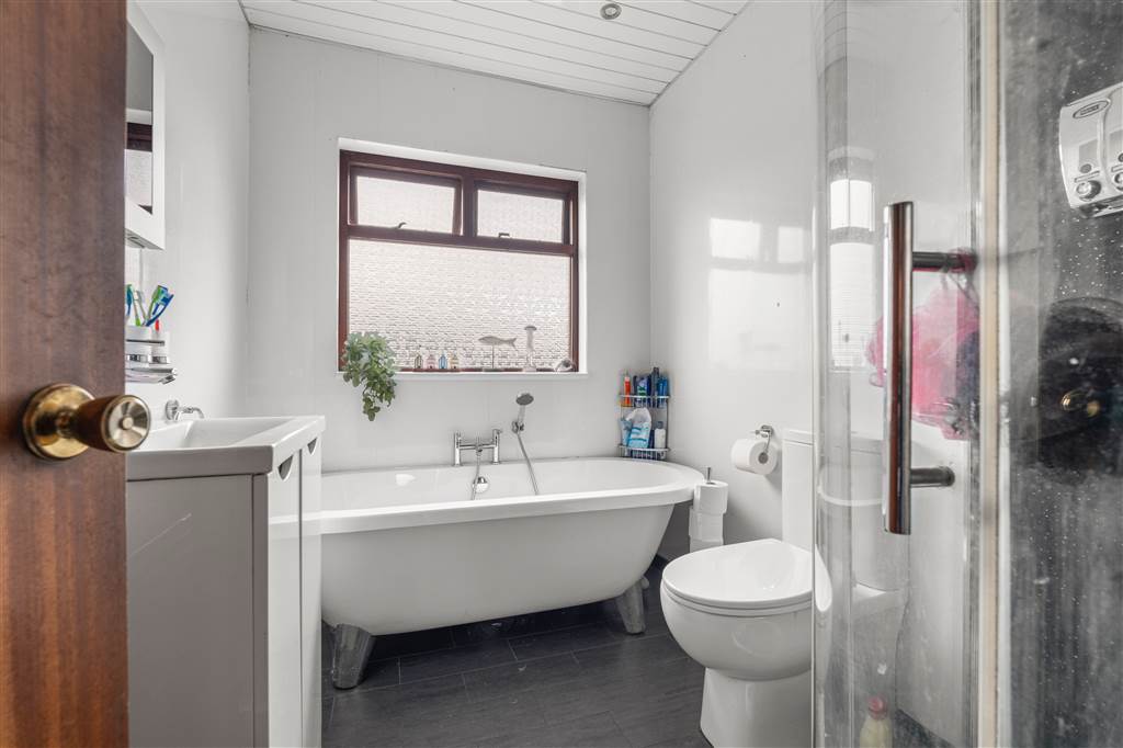 With 4-piece white suite comprising LFWC, WHB, free-standing bath with hand-held shower head over and shower to enclosed corner cubicle. Tiled flooring.