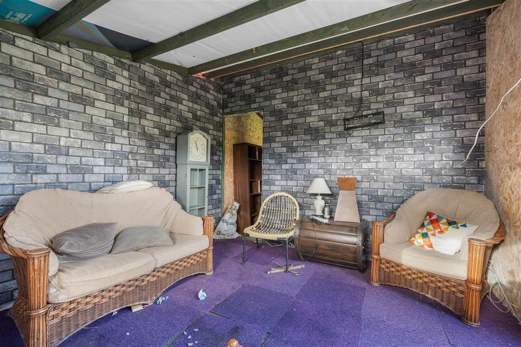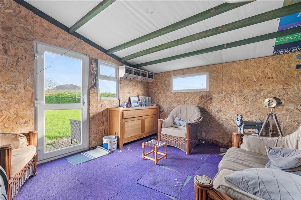 With tarmac driveway leading to spacious tarmac area for parking. Spacious gardens in lawn to front, side and rear of property with planted shrubs and hedging. Paved patio area to rear. Detached garage. Outhouse. Double car port. Large garage/workshop to rear. Paddock extending to 0.2 acres at front of property on opposite side of the road. Garden room on paddock. Outside lights. Outside tap.
