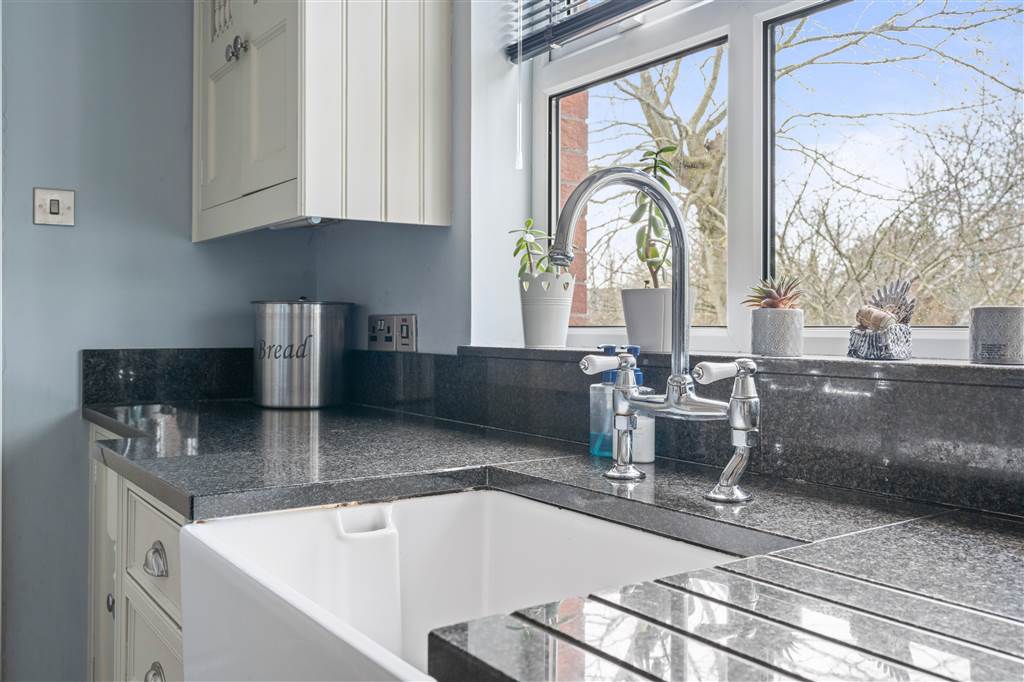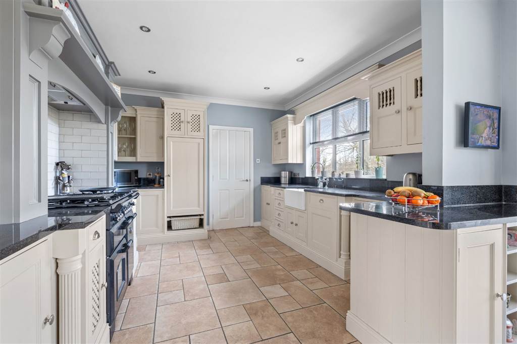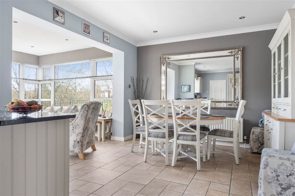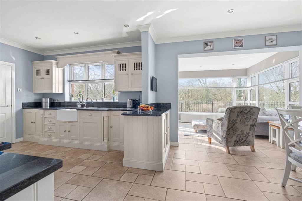 With a range of eye and low-level fitted units with granite worktop, Belfast sink with granite drainer and stainless-steel mixer tap. Space for Rangemaster style stove with extractor fan over. Integrated dishwasher. Glazed display cupboard. Cutlery drawers. Spacious area for dining. Coving to ceiling. Spot lighting to ceiling. Tiled flooring. Open plan to sun room.