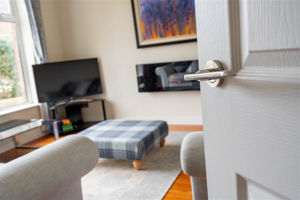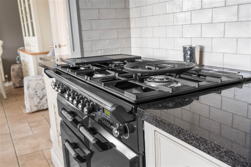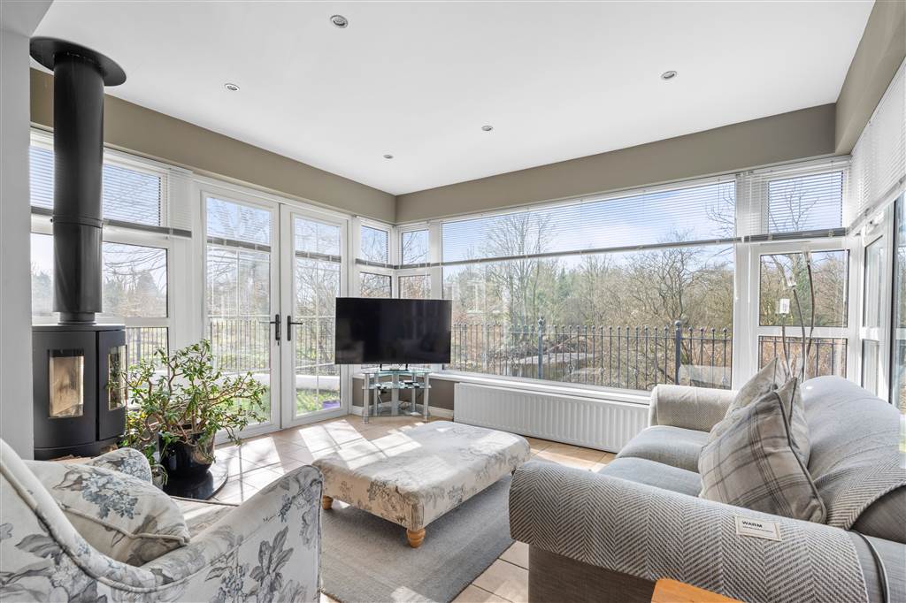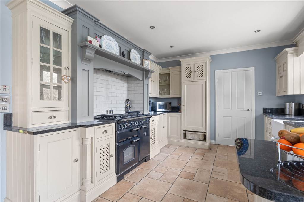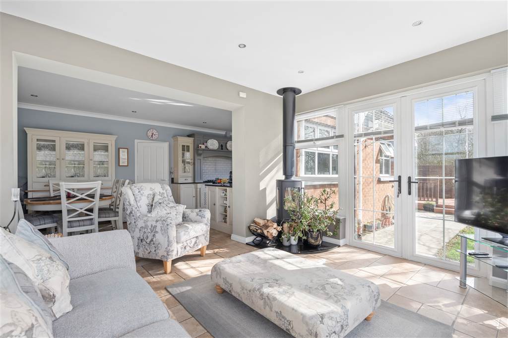 With a range of eye and low-level fitted units with granite worktop, Belfast sink with granite drainer and stainless-steel mixer tap. Space for Rangemaster style stove with extractor fan over. Integrated dishwasher. Glazed display cupboard. Cutlery drawers. Spacious area for dining. Coving to ceiling. Spot lighting to ceiling. Tiled flooring. Open plan to sun room.