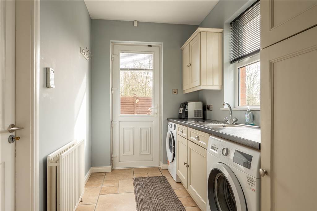With a range of eye and low-level fitted units, stainless-steel sink unit and drainer with stainless-steel mixer tap. Plumbed for washing machine. Space for tumble dryer. Tiled flooring. PVC door to rear. Door leading to integral garage.