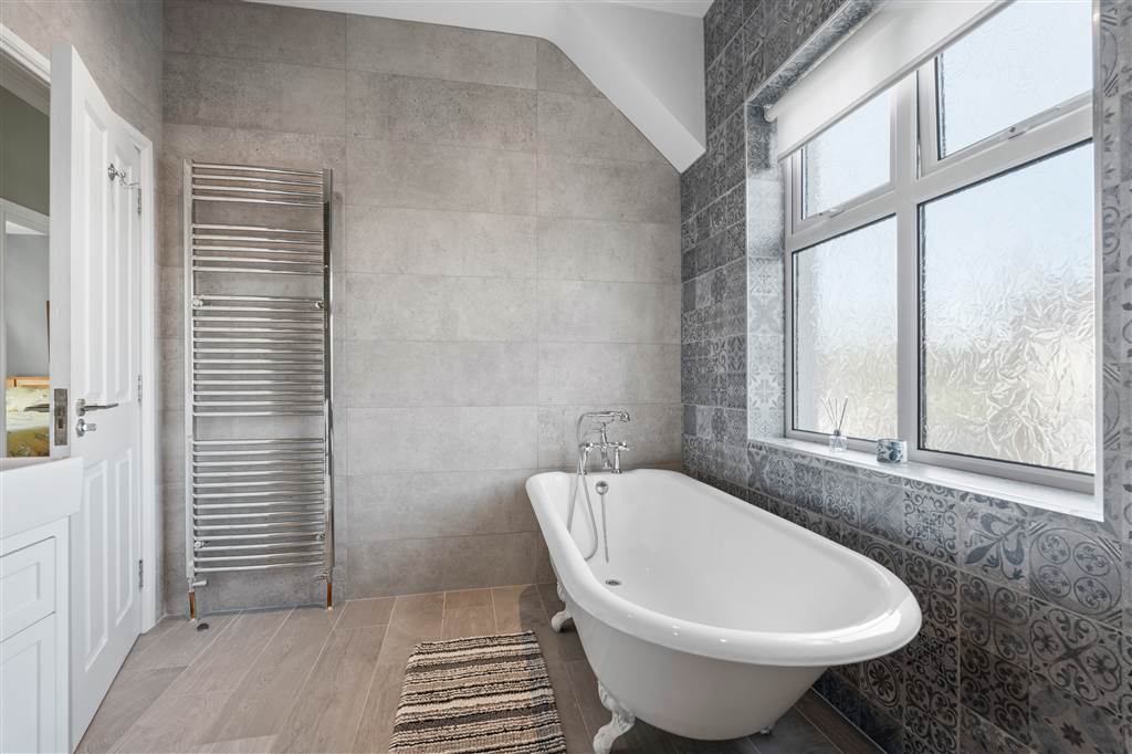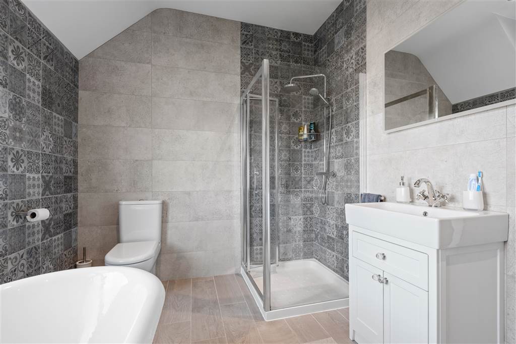 With 4-piece white suite comprising LFWC, WHB with built-in vanity unit, free-standing claw foot bath with telephone style hand-held shower head and shower to enclosed tiled corner cubicle. Heated towel rail. Tiled walls. Wooden effect tiled flooring.