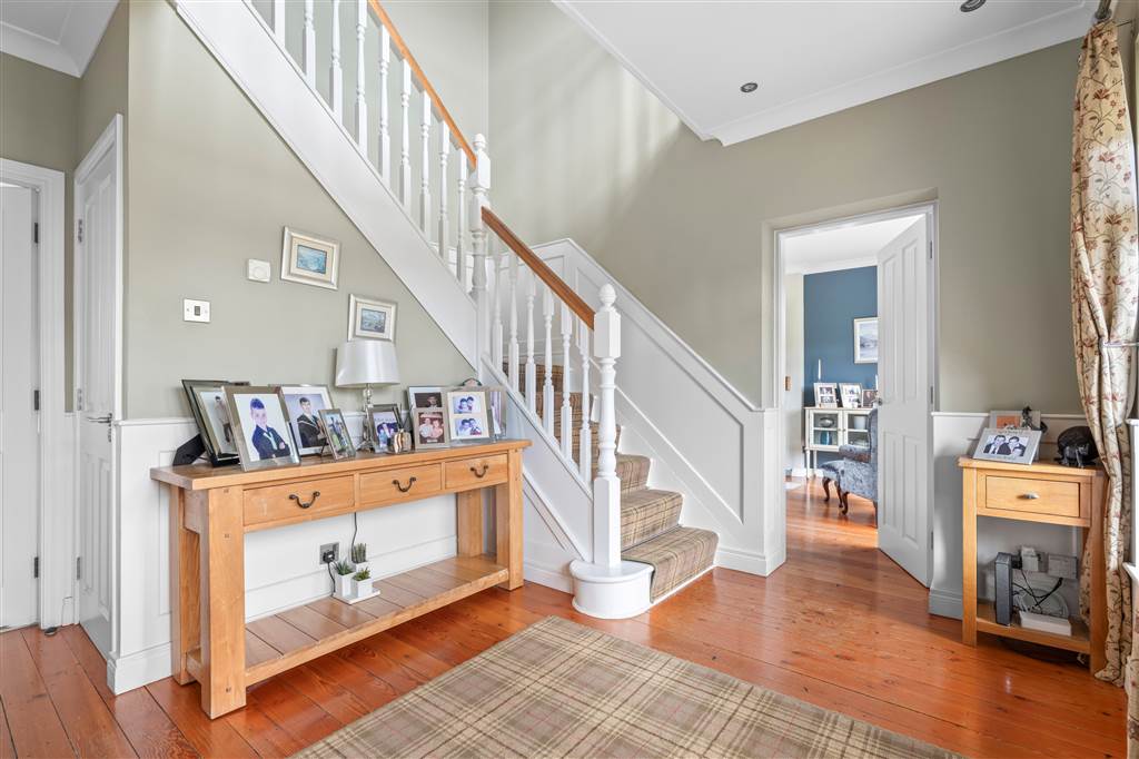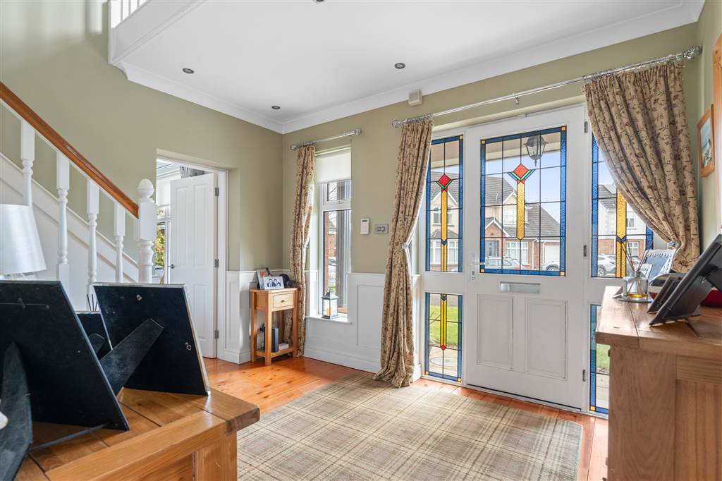 With hardwood front door with decorative glazed panes and decorative glazed side panes. Balustrade staircase to first floor. Wooden panelling to walls. Coving to ceiling. Spot lighting to ceiling. Wooden flooring.