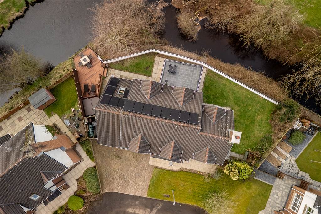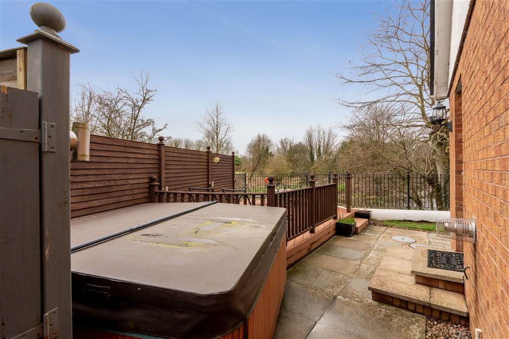 With paved drive at front of property for parking. Garden in lawn to front with planted shrubs. Paved area from front door leading to gate to rear. Enclosed rear bounded by wall, railing, wooden fencing and gates. Garden in lawn to rear. Paved patio area. Elevated composite decking area ideal for BBQ season and outdoor entertaining. Excellent privacy. Peaceful setting over looking the Braid River. Outside tap. Outside light.
