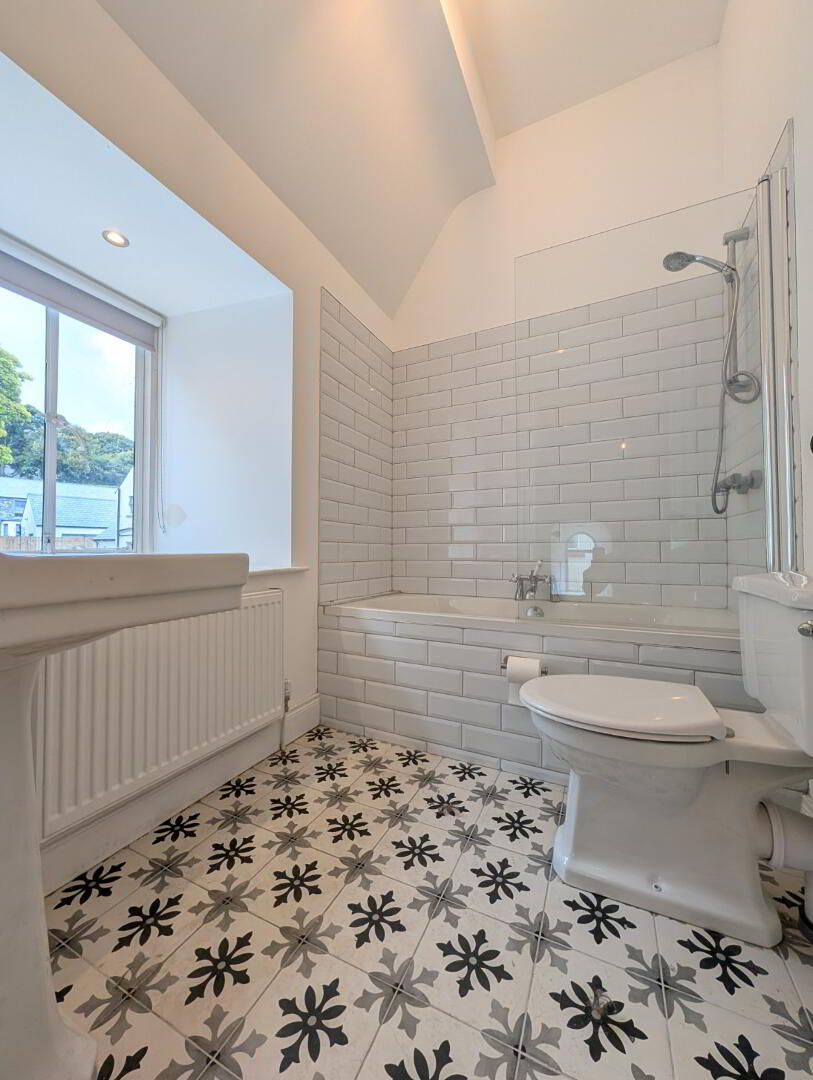 En-suite Bathroom - White suite comprising low flush back to wall WC, high gloss vanity unit housing WHB with mono tap, panel bath with handheld shower fitting, quadrant shower unit with dual head power shower, white high gloss metro brick wall tile, porcelain smoked oak plank floor tile, Velux window