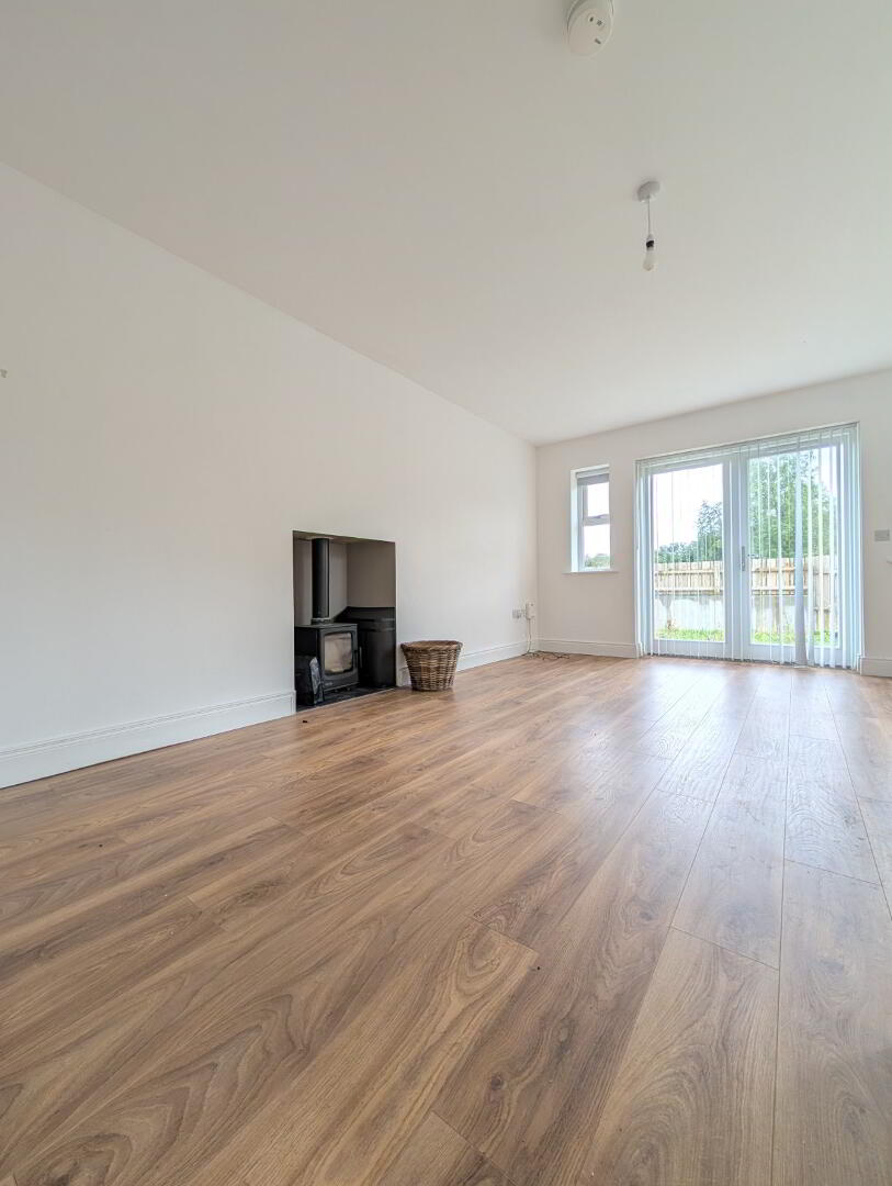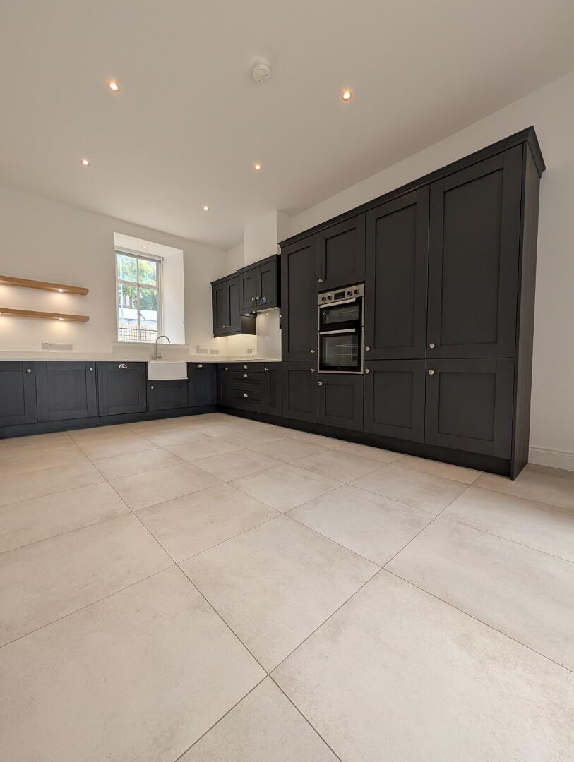 Kitchen / Dining - Concrete grey floor tile, range of high- & low-level charcoal grey contemporary shaker style kitchen units, down lighters to units and shelving, all appliances integrated - oven and grill at eye level, touch operated ceramic hob with overhead extractor, dishwasher, fridge/freezer, washing machine, ceramic ‘Belfast’ sink with mono tap & drainer, recessed spot lighting, French doors opening to rear gardens