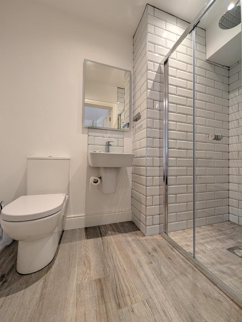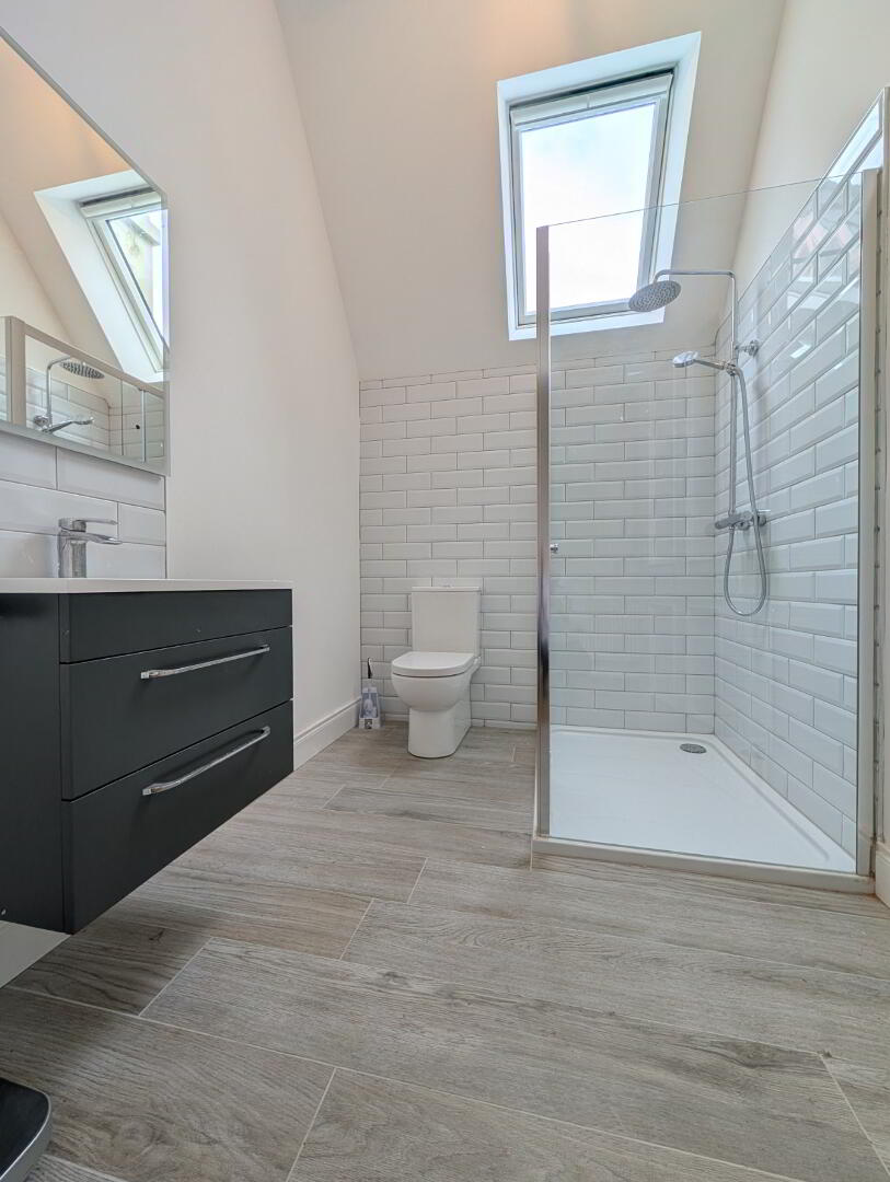 En-suite Shower room - White suite comprising low flush back to wall WC, high gloss vanity unit housing WHB with mono tap, quadrant shower unit with dual head power shower, white high gloss metro brick wall tile, porcelain smoked oak plank floor tile, Velux window