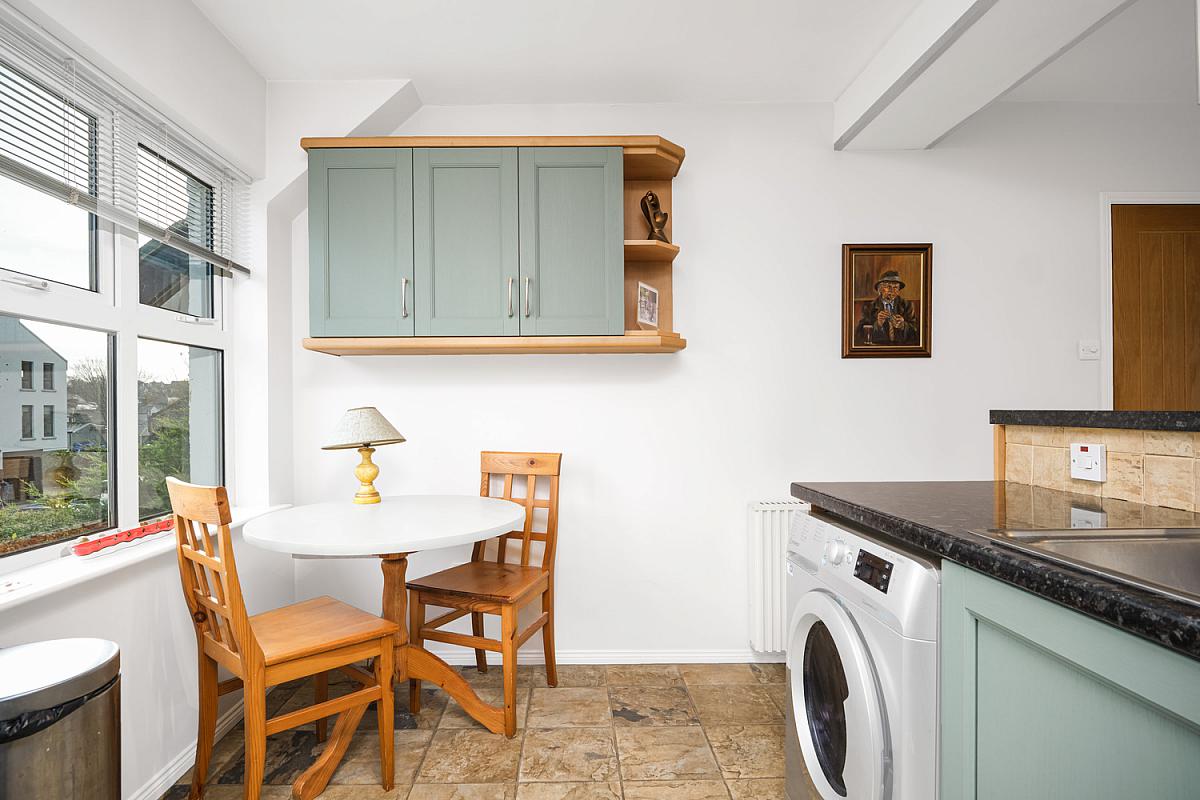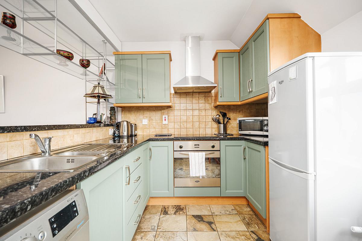 With single drainer stainless steel sink unit, range of high and low level units with tiling between, integrated ceramic hob, oven, stainless steel extractor fan, space for fridge freezer, plumbed for automatic washing machine, shelving, additional glass shelving and tiled floor.