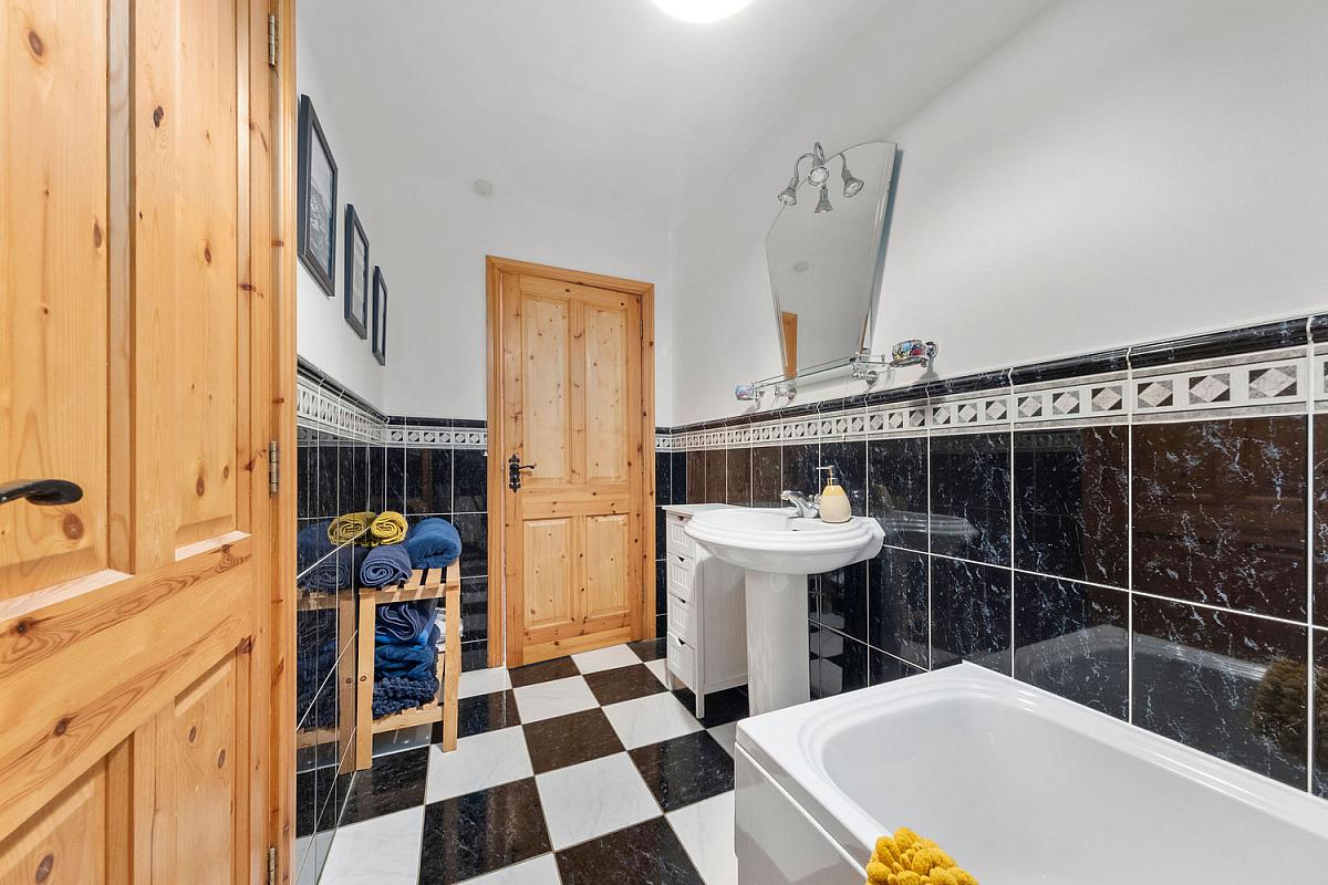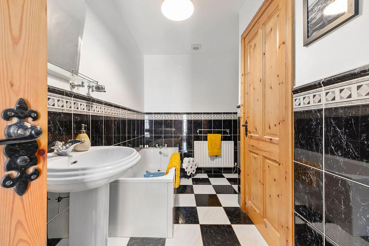 With white suite comprising w.c., wash hand basin, bath with tiled surround, hot press, half tiled walls, extractor fan and tiled floor.