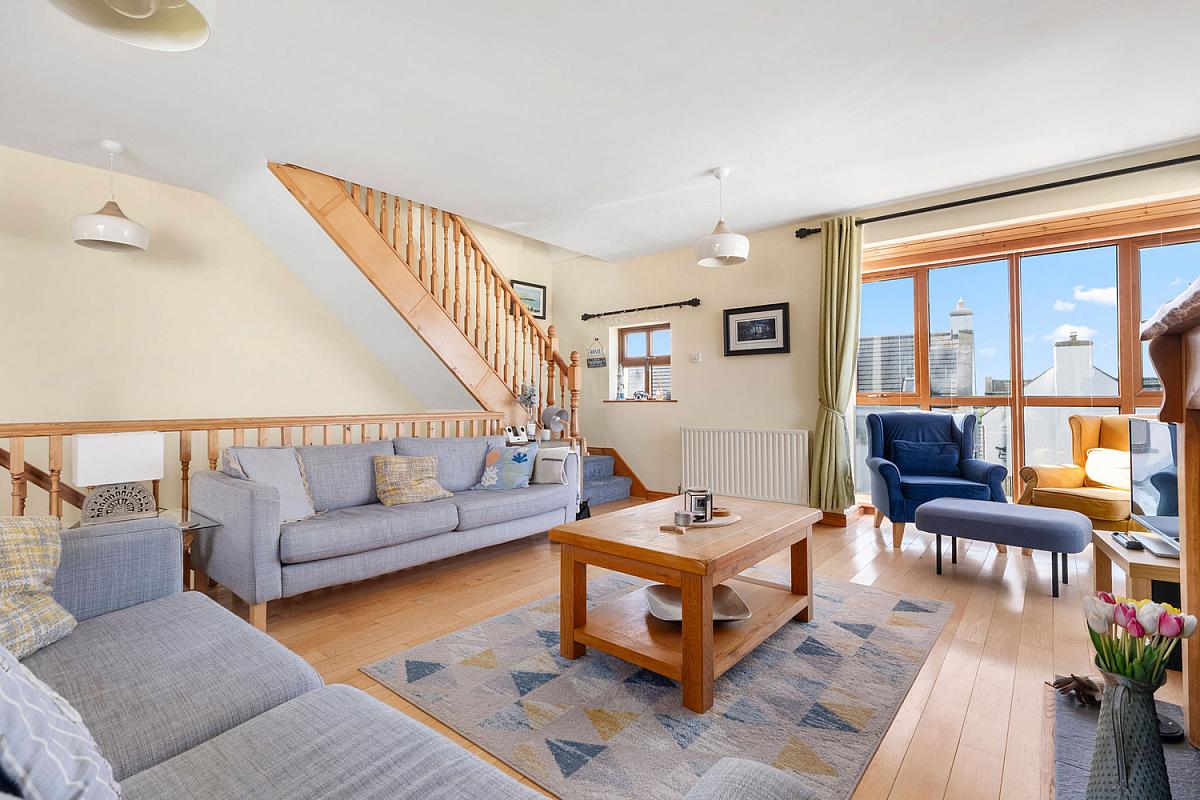 Along the side of the property is a paved parking area. The rear garden is accessed via steps or through a first floor door, leading to an attractive outdoor space mainly laid to lawn, with a paved patio and a raised shrub bed featuring a variety of mature plants. Stoned section with a paved pathway to the front. Light to front and rear.