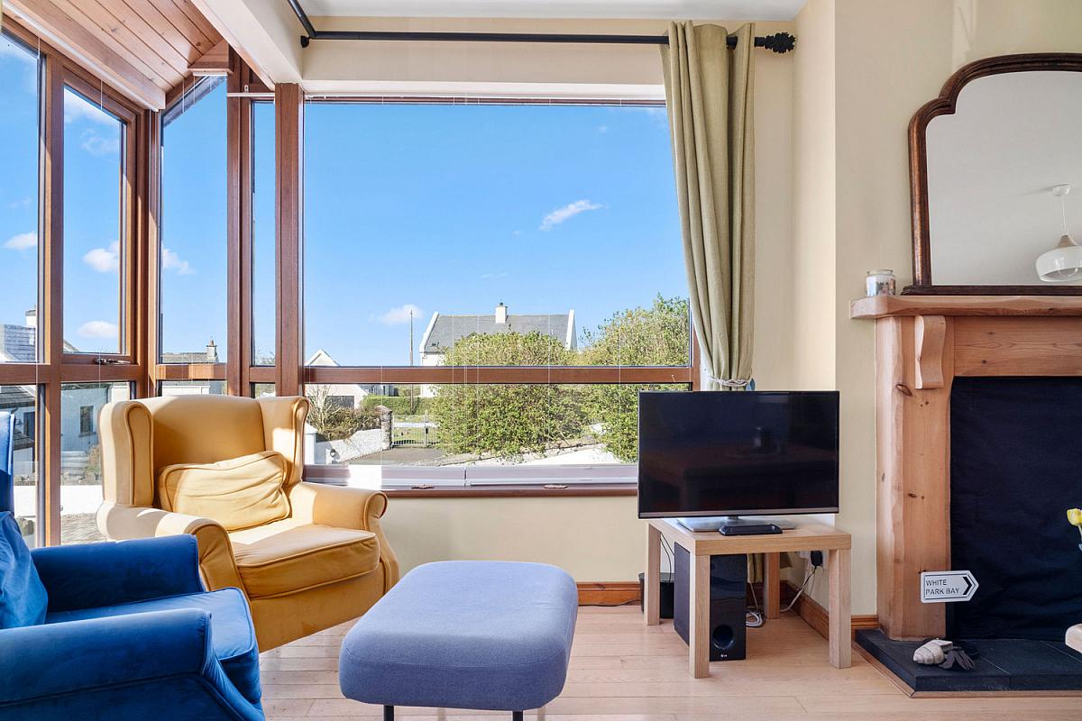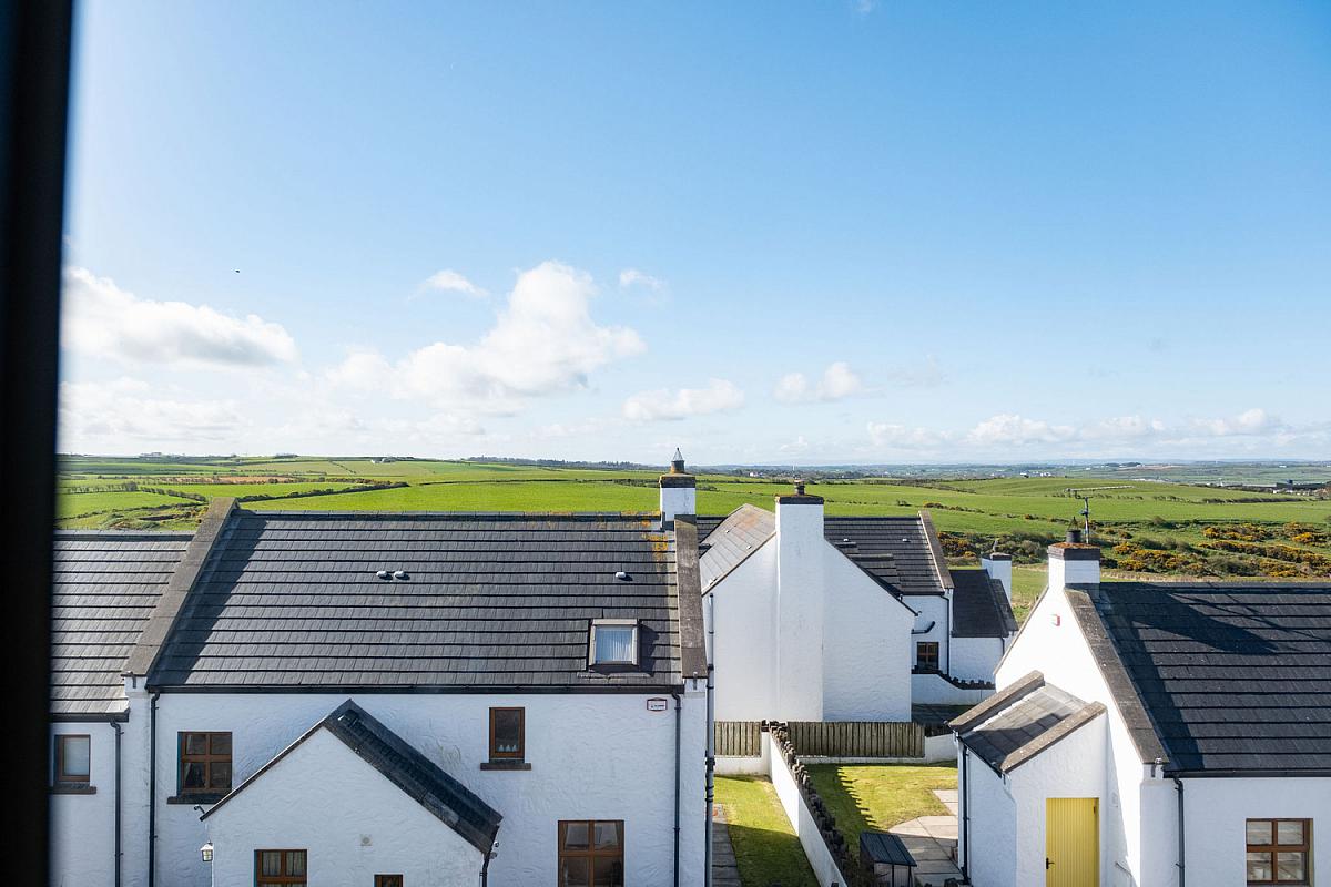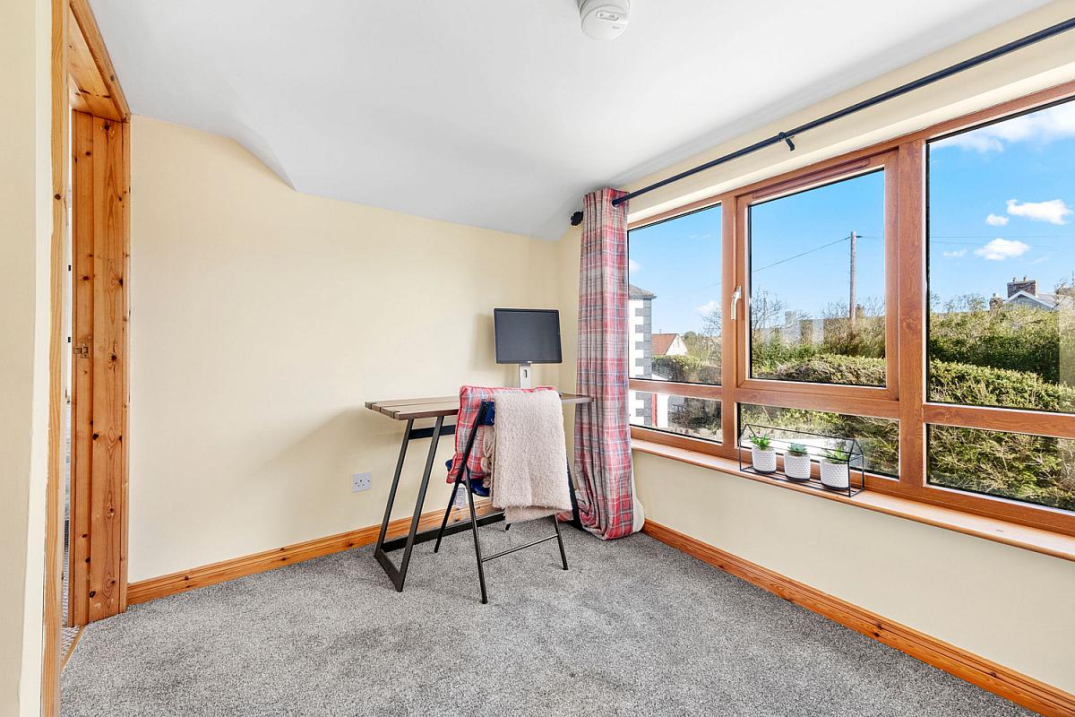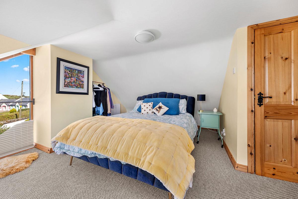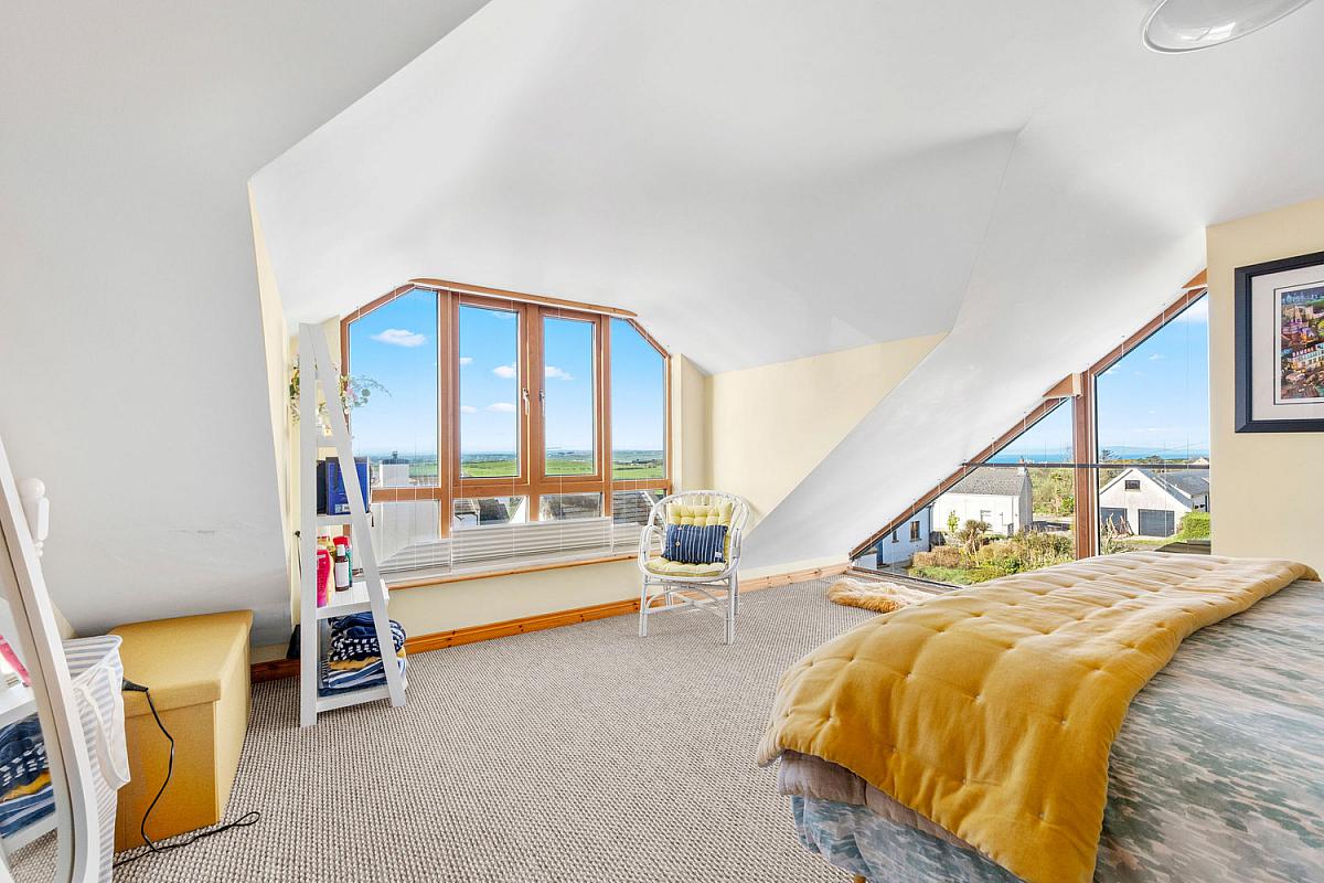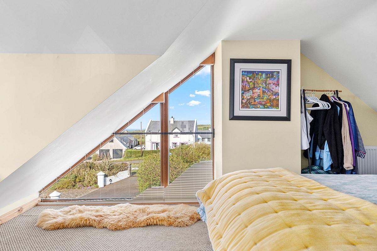 With an angled window built into the sloped wall and large multi pane window with a wooden frame offering a wide open view of the landscape. Views across Atlantic Ocean and Donegal Headlands. 14'7 x 11'0