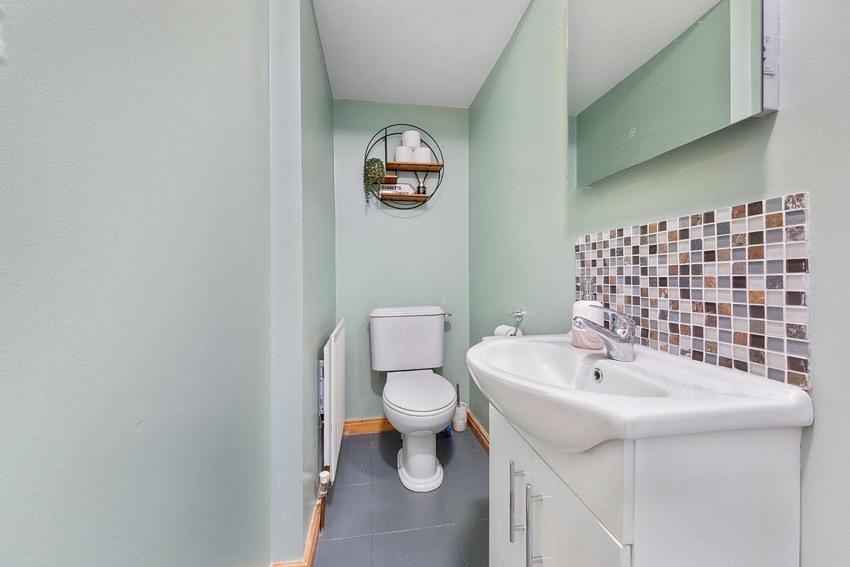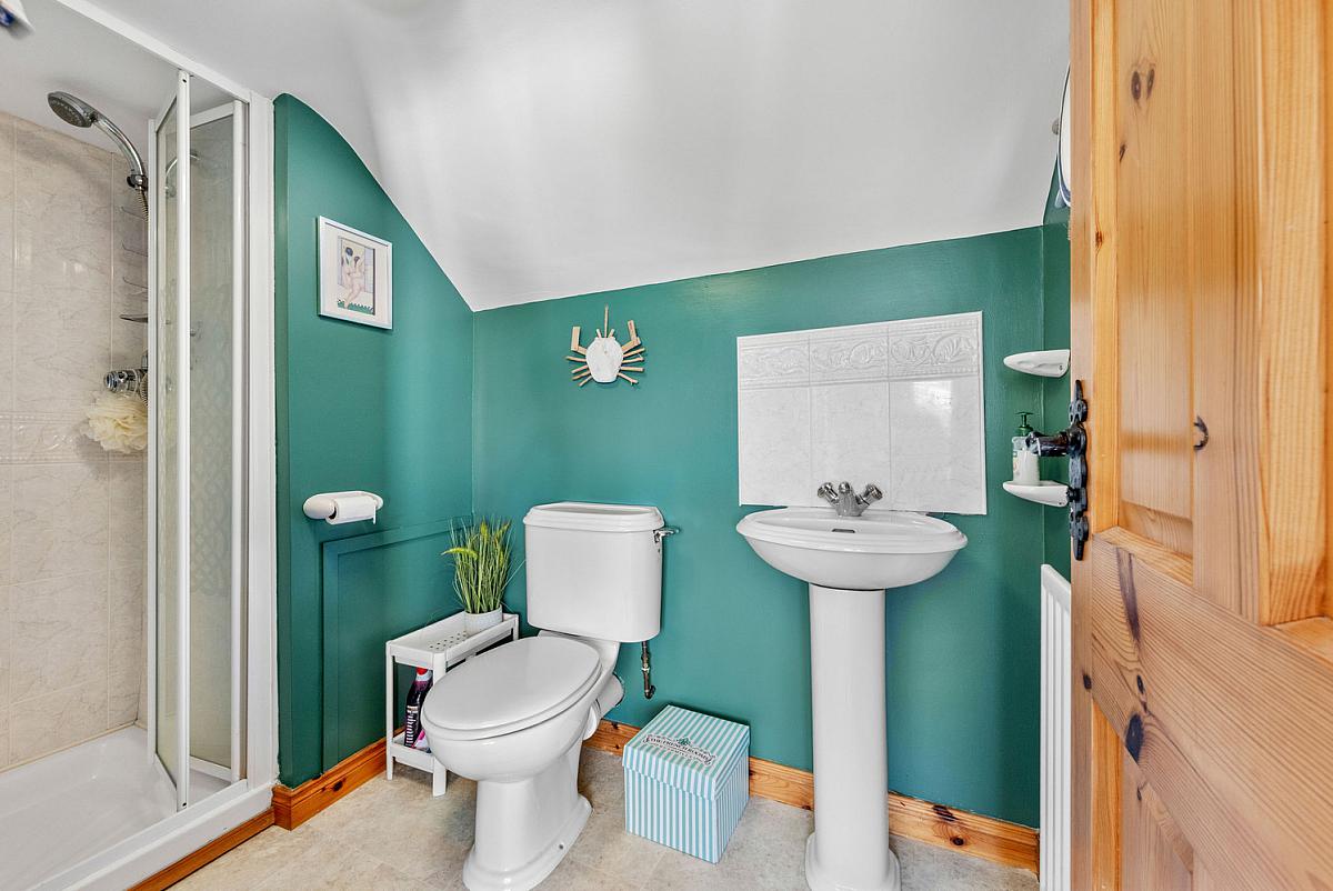 With white suite comprising w.c., wash hand basin with tiled splashback, fully tiled walk in shower cubicle with mains shower and extractor fan.