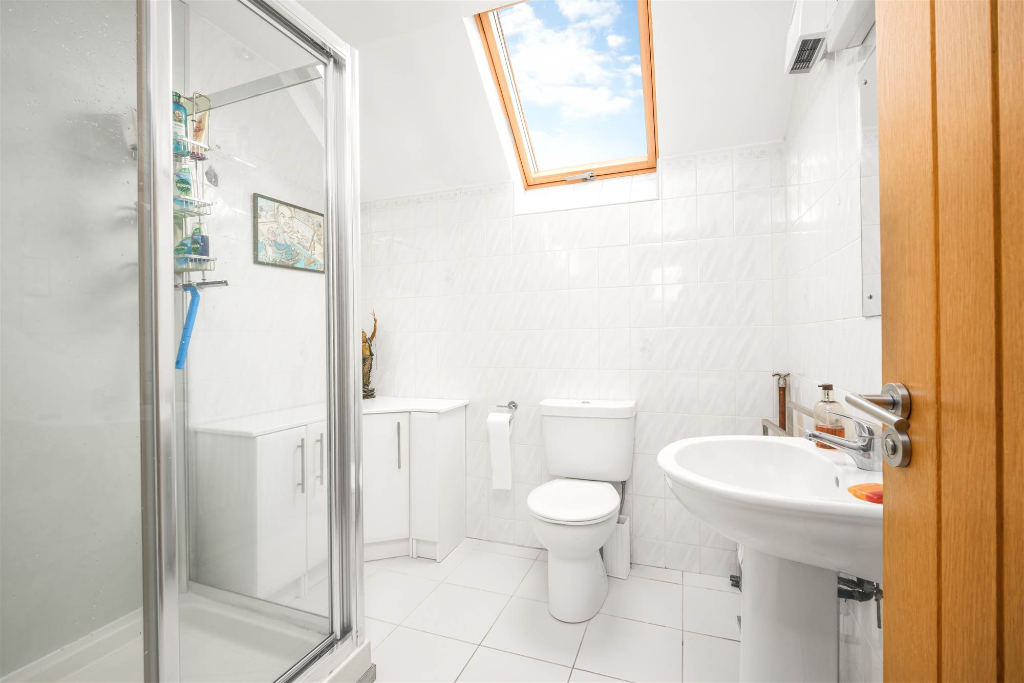 With white suite comprising w.c., wash hand basin, PVC clad walk in shower with mains shower, shaver light and power point, built in corner units, "Velux", recessed lighting and tiled floor.