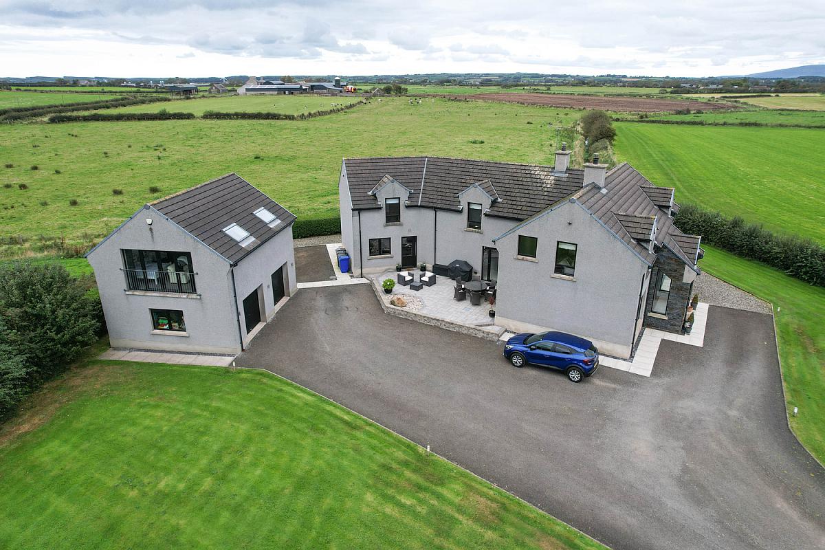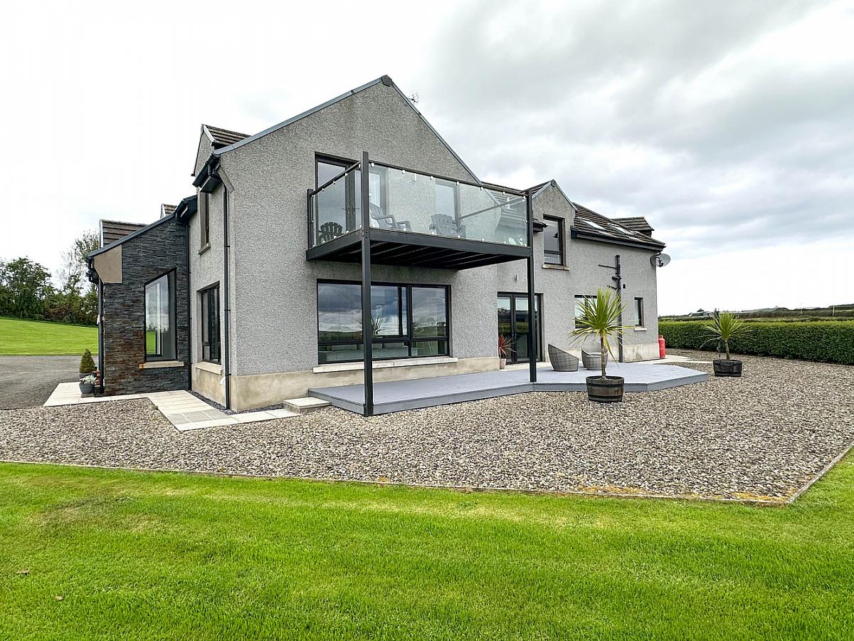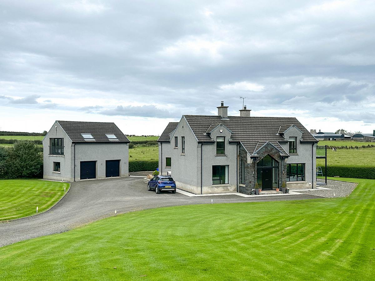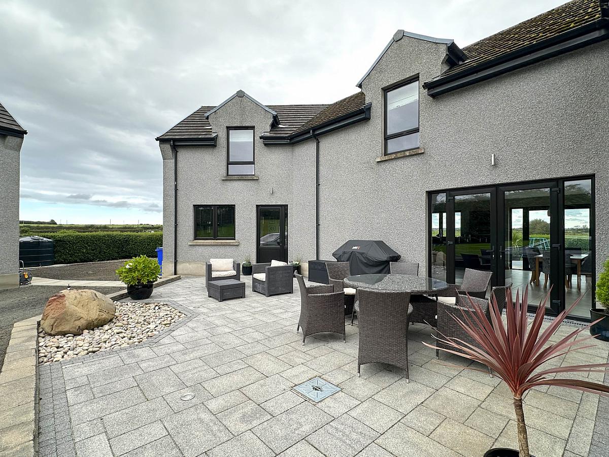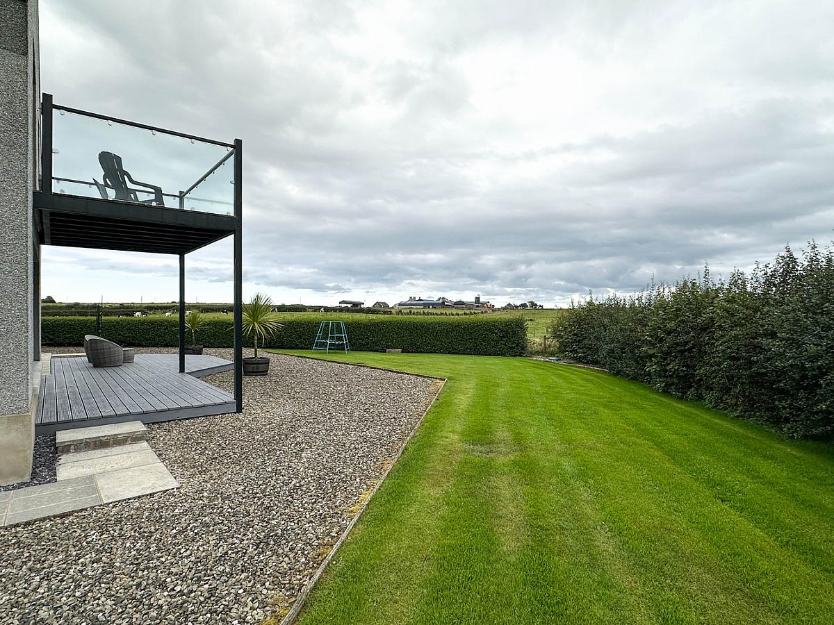 Spacious garden laid in lawn, total site extending to approximately 1 acre, bordered by hedging with trees and shrubs. Outside water tap. Laneway leading to extensive parking with edge lighting. Outside lights around the property. Raised patio area with low level lighting. Decking area with low level lighting and power point. Screened bed around the decking area. Path around the property. PVC oil tank. Septic tank. Second laneway currently used for bins only.