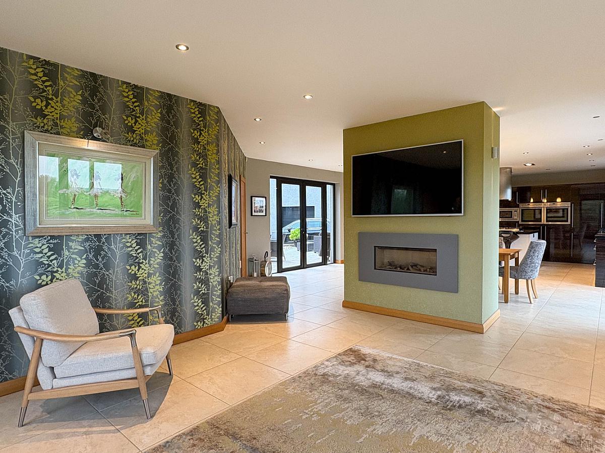 With central feature wall housing Gazco glass fronted gas fire with remote control, recess and wall lighting, tiled floor, Beam vacuum point, storage cupboard. Open plan to: