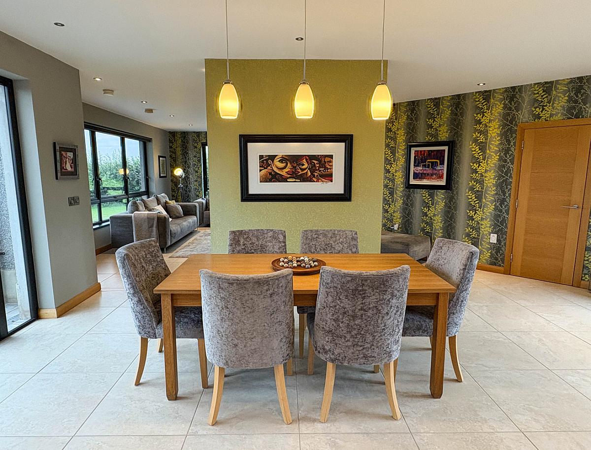 With tiled floor, recess and pendant lighting, uPVC glass panel French doors on both ends of the room â" 1 leading to patio area at the rear and 1 leading to decking area at the front of the property.