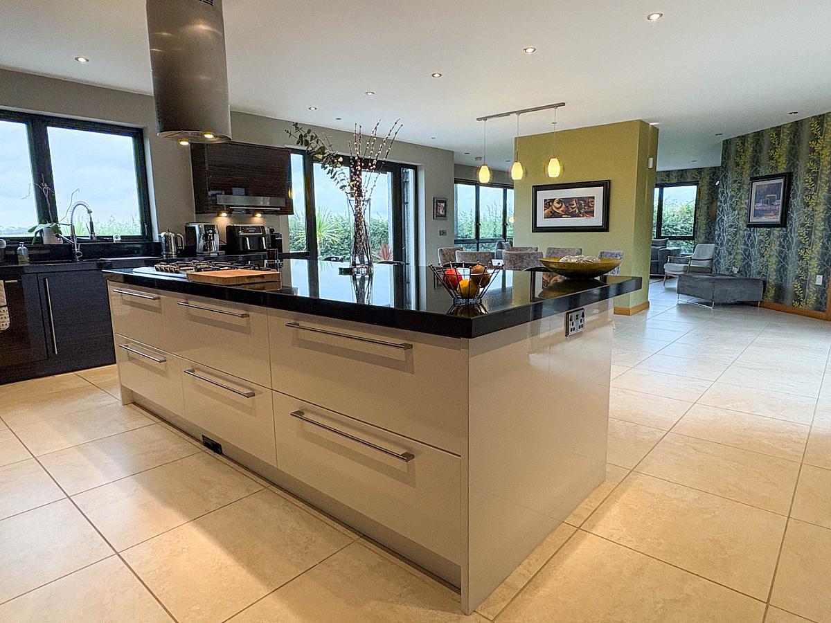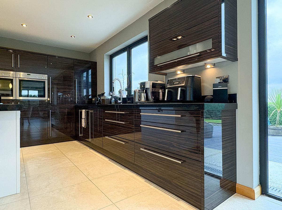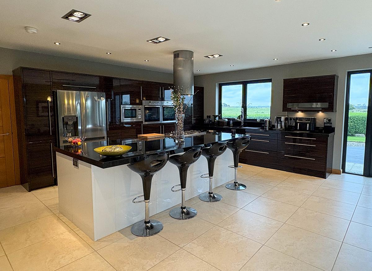 With Zebrawood units comprising bank of units, eye and low level units - including 2 larder units with pull out drawers and shelved units, 2 sets of saucepan drawers and pull out corner unit, Blanco one and a half bowl stainless steel sink unit with pre rinse spray unit tap, granite work top, integrated AEG dishwasher, 2 Neff ovens, Neff microwaves, space for American style fridge / freezer. Large island unit with 3 sets of saucepan drawers, Stove 5 ring gas hob, CDA island extractor hood, seating for 4 stools. Recess and feature lighting, tiled floor, television point.