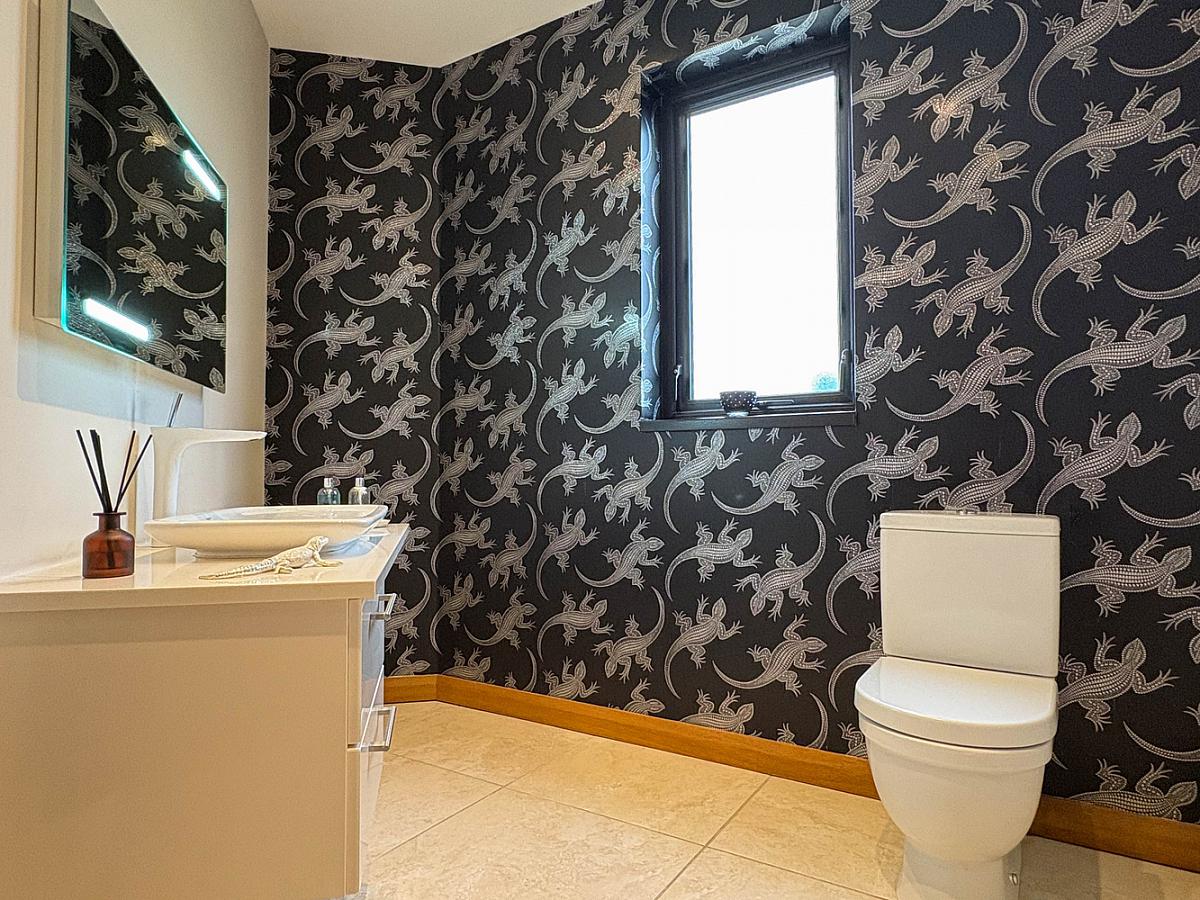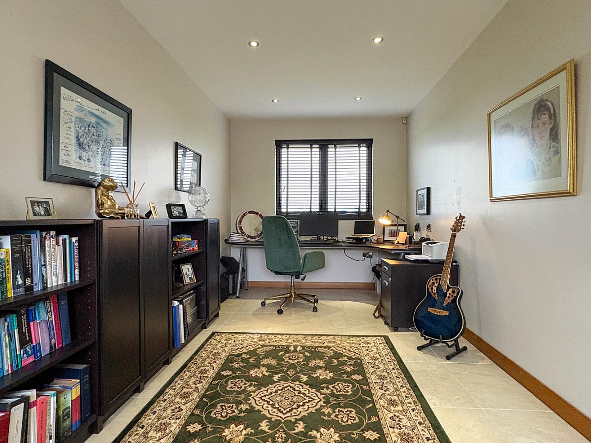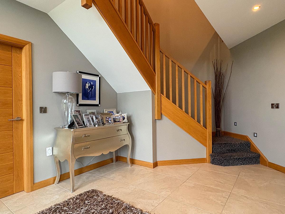 With low level and wall lighting, Beam vacuum point, walk-in linen cupboard with sensor light and housing pressurised system. Gallery style landing overlooking entrance hall with glass panels.